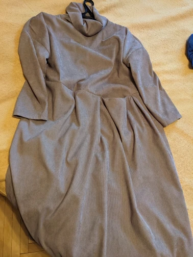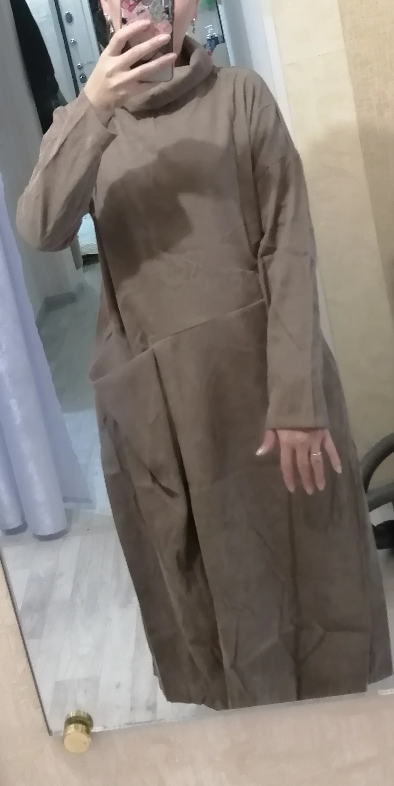 Платье в мелкий рубчик. Но сомневаюсь, что это вельвет. Синтетика. На мой 54 раз ну очень оверсайз. Придётся ушивать.По ОГ 110 см хорошо, а дальше мешковато. Рост 156 см. Платье в пол. Придётся ушивать. Подправив будет хорошо.