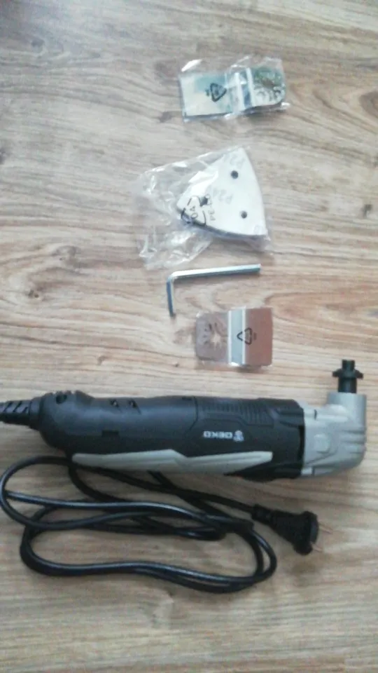 доставили на почту за неделю. собран хорошо, но придирка к кнопке включения слишком слабое переключение и небольшой люфт, шум при работе терпимый, в комплекте ключ, две насадки, треугольная насадка с наждачной бумагой, инструкция на английском, вилка евро