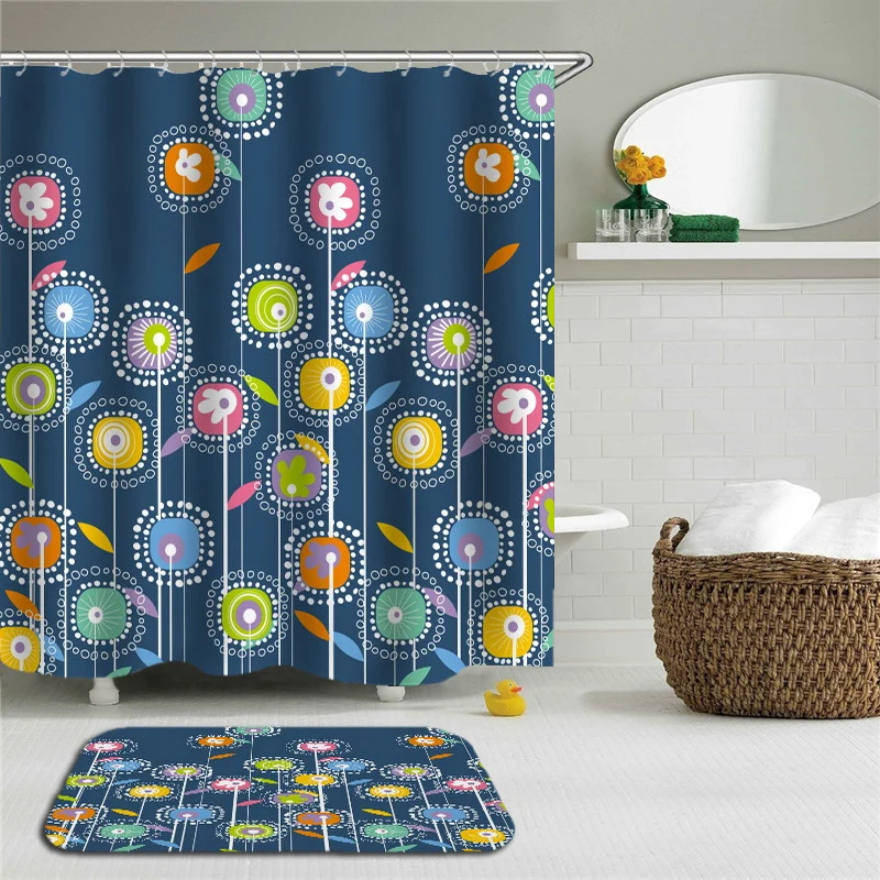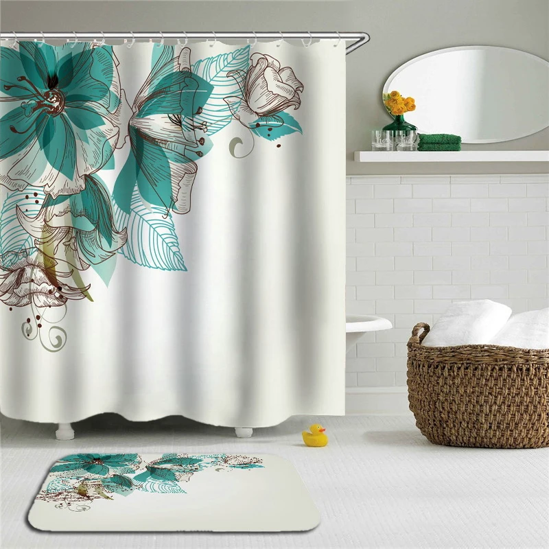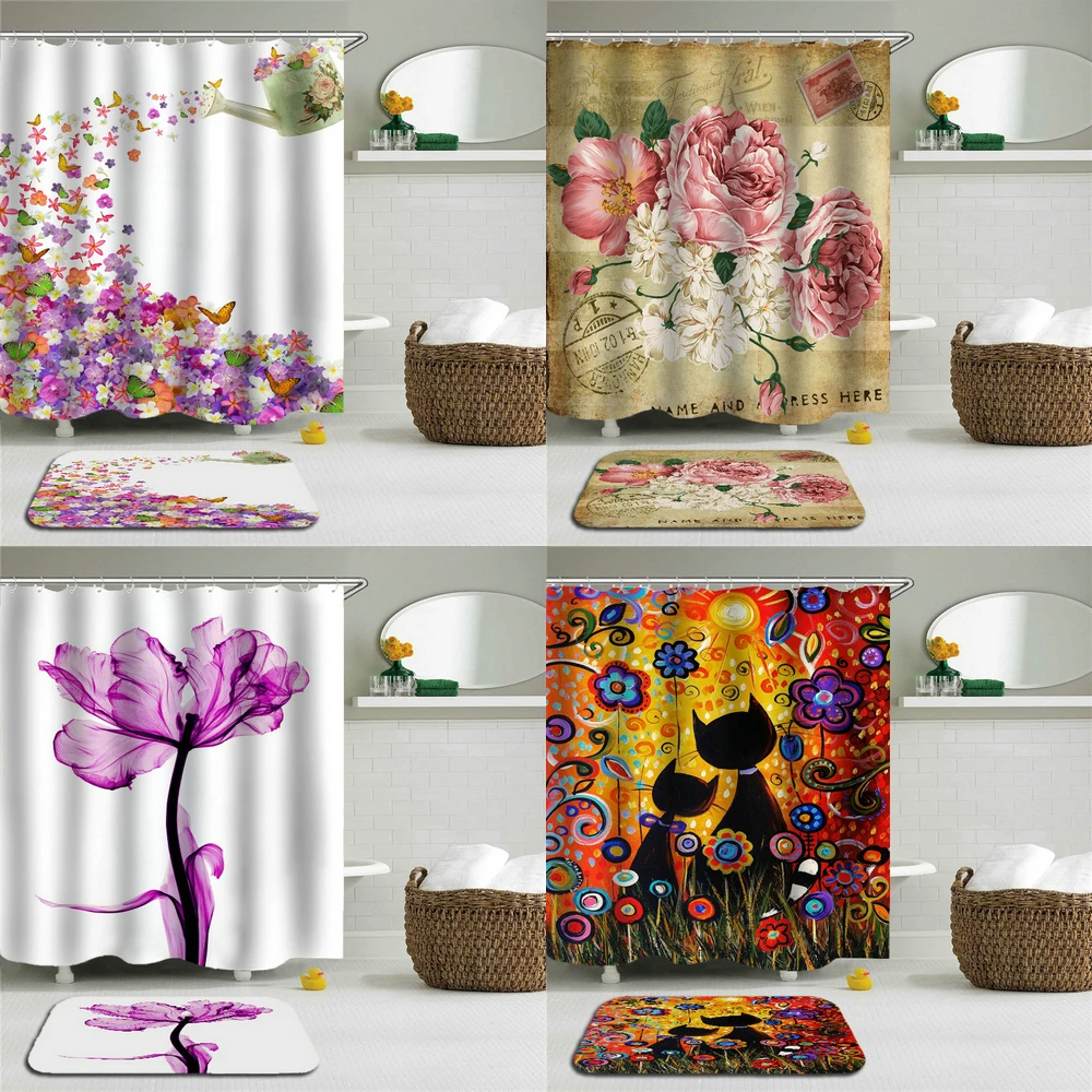 2 шт./лот, набор ковриков для душа с цветочным принтом, водонепроницаемая занавеска для душа из полиэстера с нескользящим ковриком для ванной