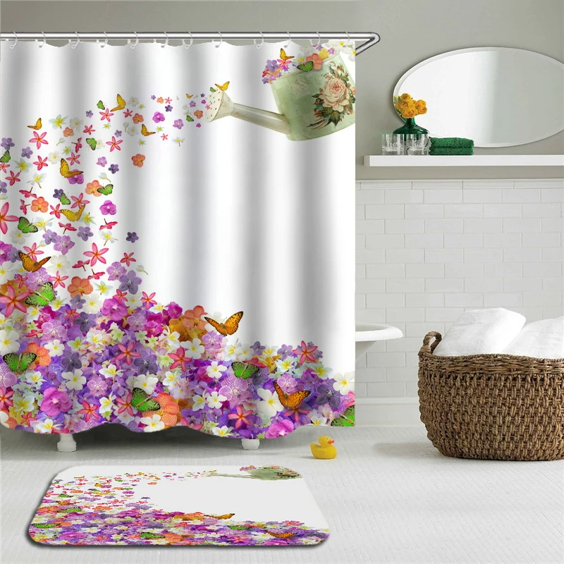 Водонепроницаемая занавеска для душа с изображением цветов и бабочек