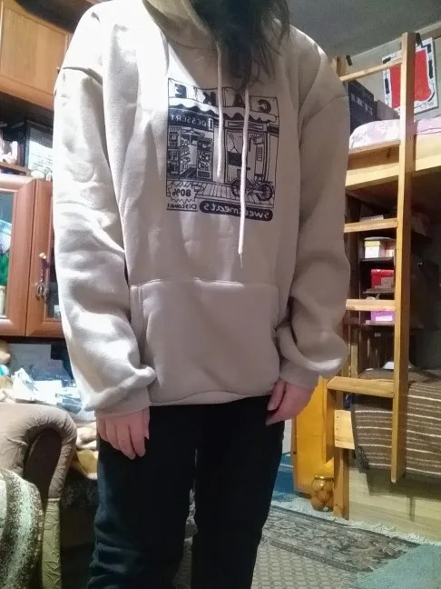 к сожалению без фотографии. толстовка меньше чем на фотографии. достаточно теплая и удобная в носке. принт хорошего качества но через месяца два три активных стирок будет стираться