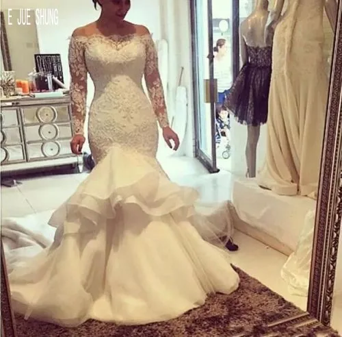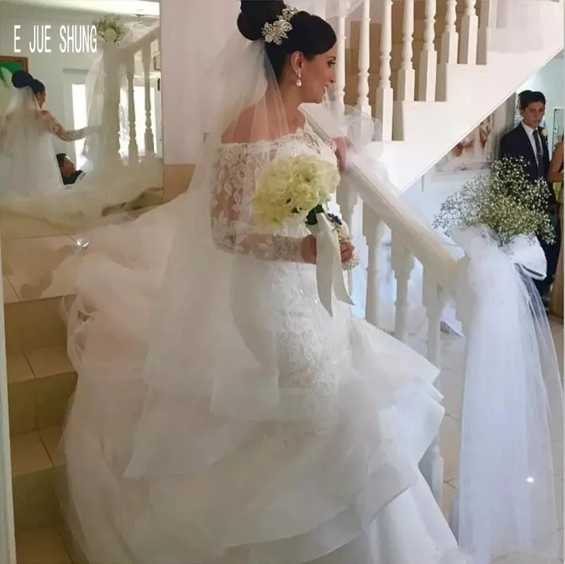 Женское свадебное платье с юбкой-годе E JUE SHUNG, белое платье с открытыми плечами и длинными рукавами, свадебное платье