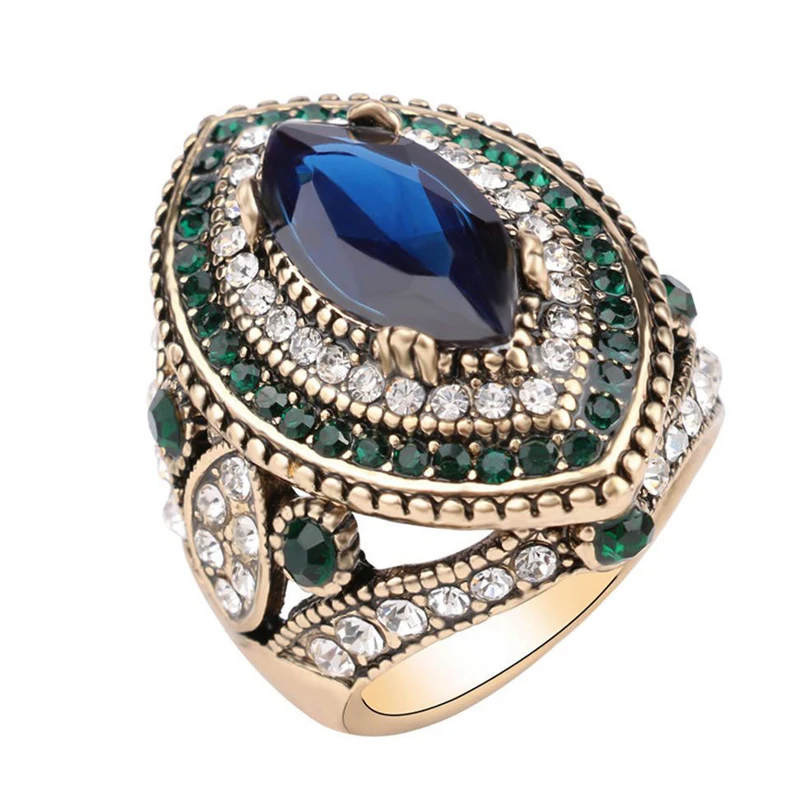 Кольцо женское, винтажное, золотое, Синий, Красный Кристалл Стразы