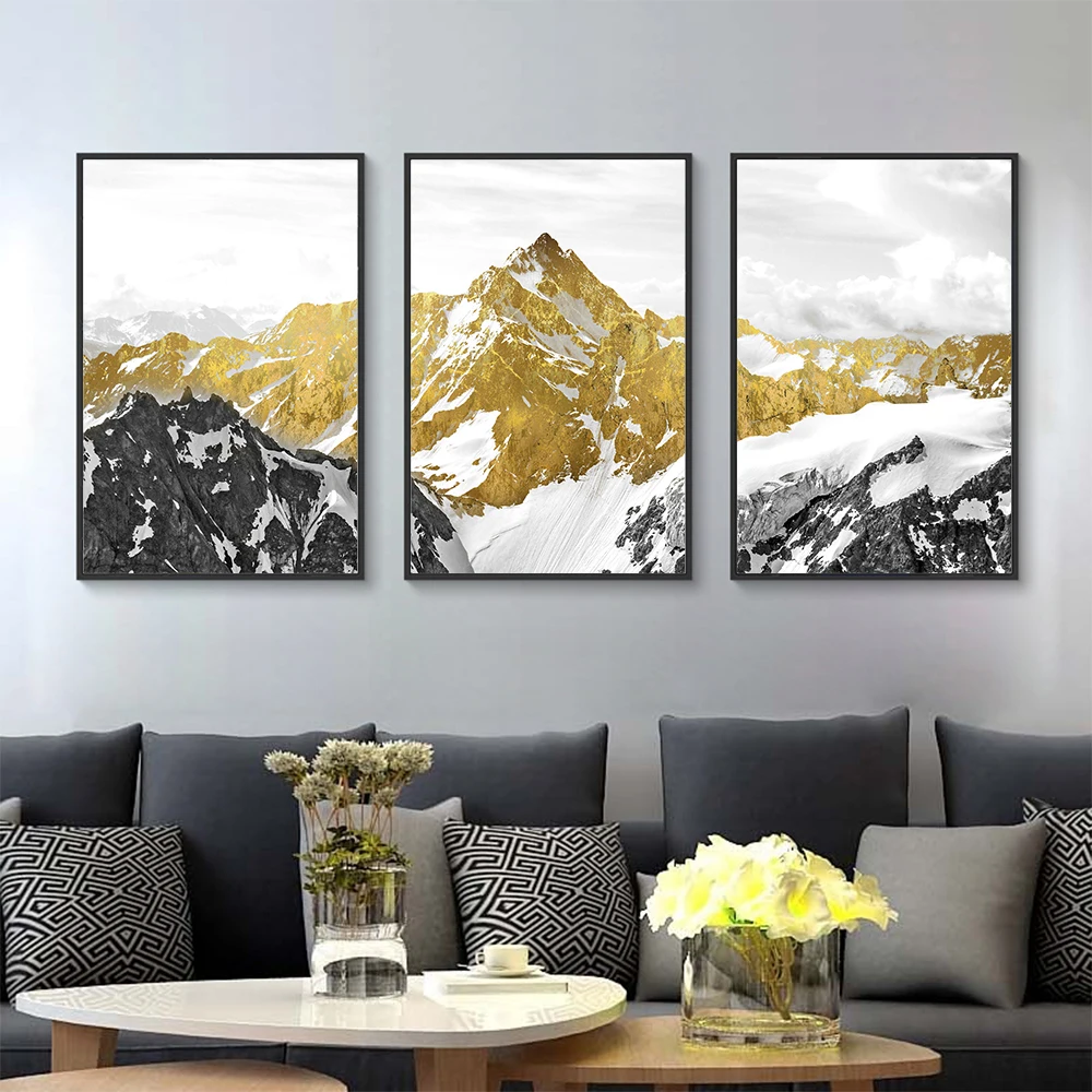 Постер с изображением Золотой Снежной Горы, 3 панели для гостиной, офиса, дома
