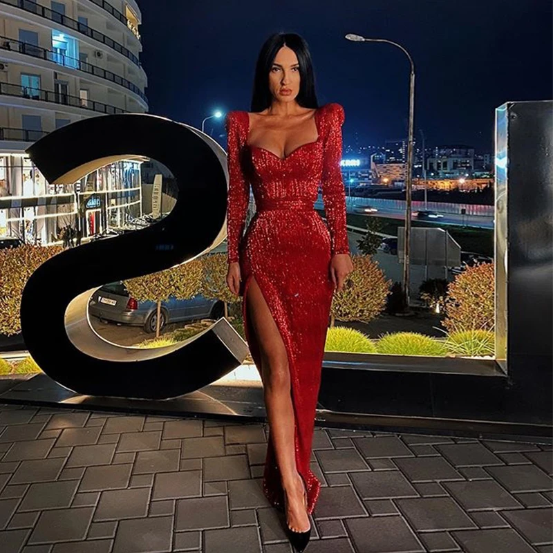 Стильное вечернее платье с глубоким вырезом, с разрезами по бокам, с длинным рукавом