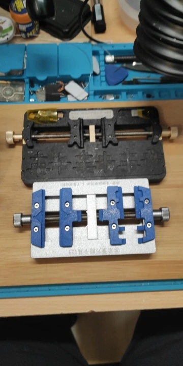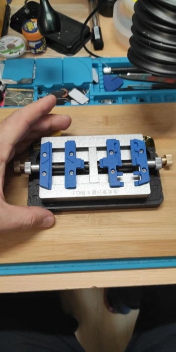 Сделано все основательно, но кривыми руками. Непонятно назначение тяжелой пластины снизу, открутил, хоть легче держатель стал, а он и без нее тяжелый. На губках под микросхемы что стоило сделать еще пропилы под чипы помельче? Места полно же. Сделаю сам. При этом регулировочные винты болтаются ввиду не совпадающего отверстия, на последнем фото видно. Придется делать втулку. Пздц...