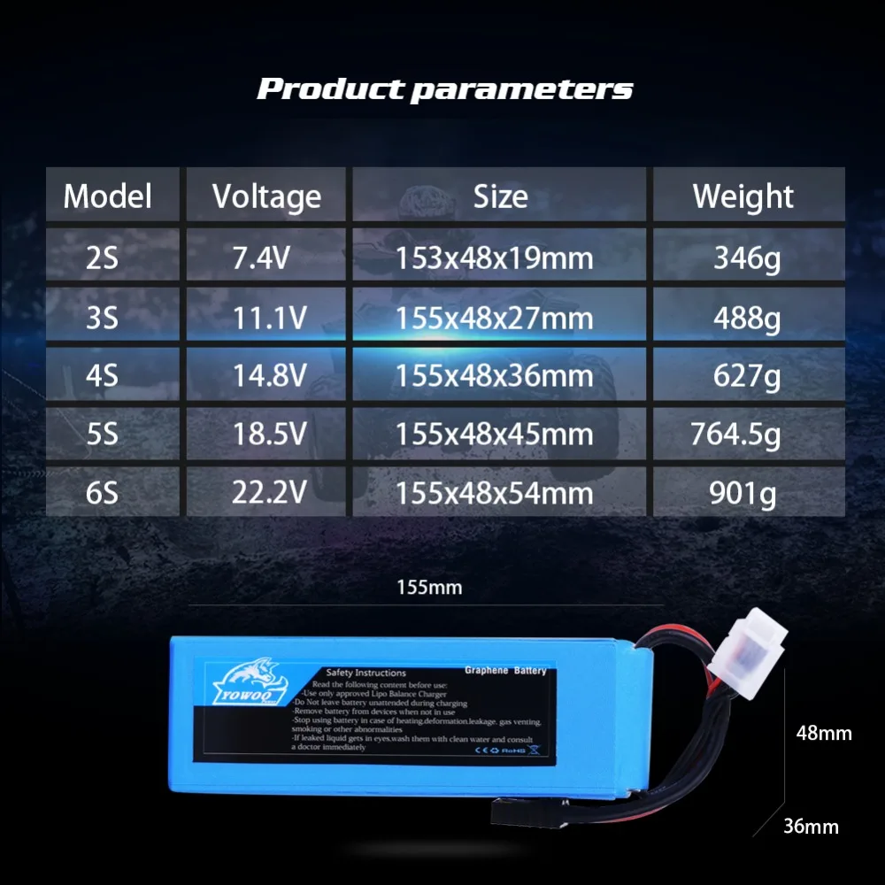 4S1P 14,8 V 6000mah 100C:155 мм x 48 мм x 36 мм, 627 г