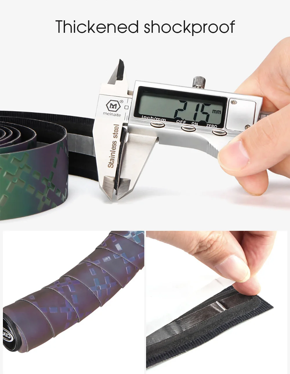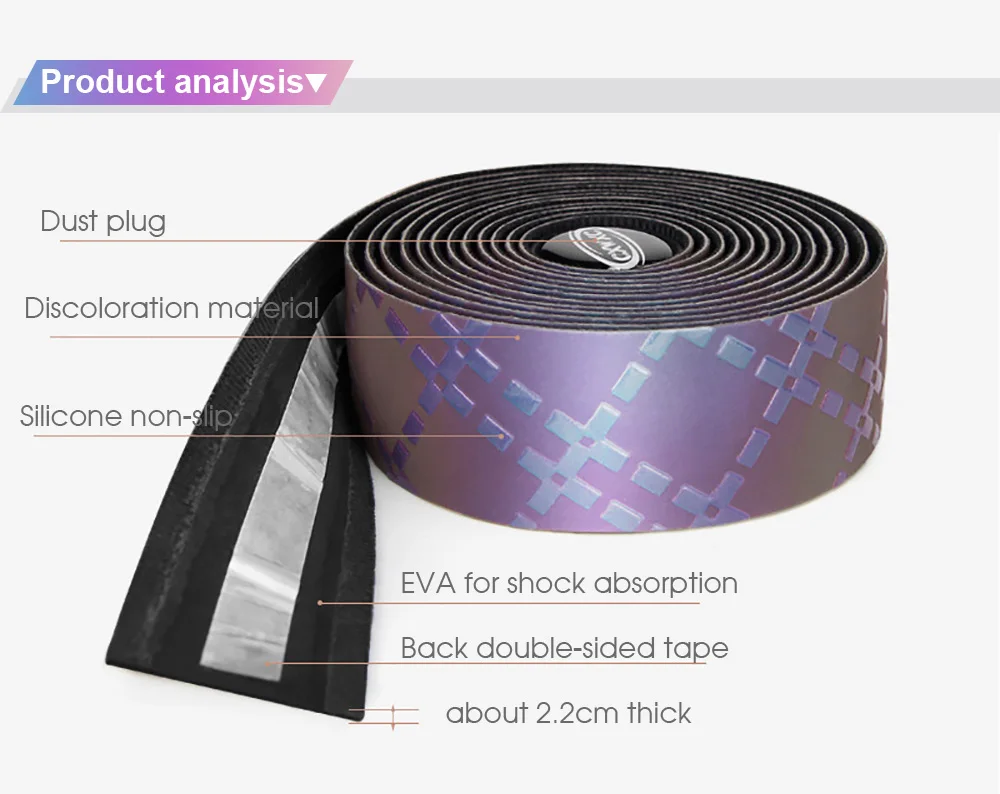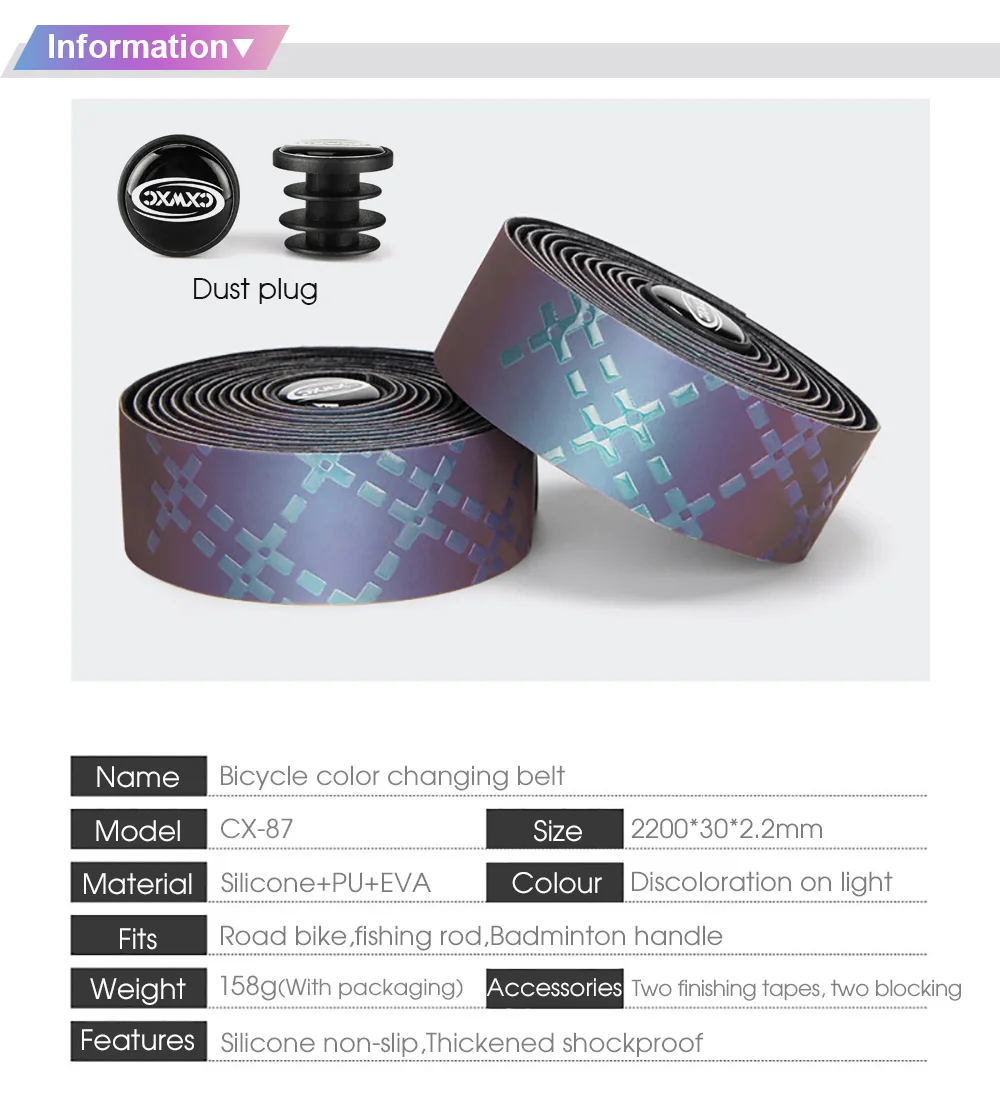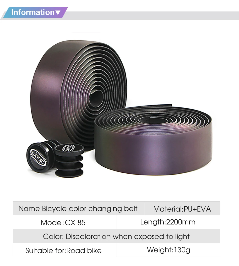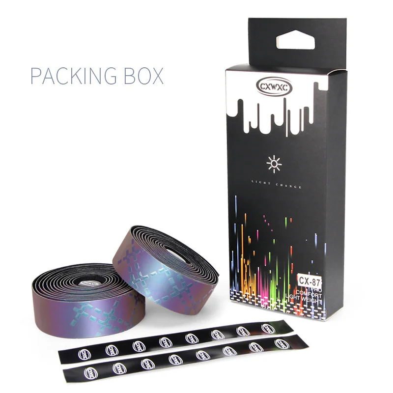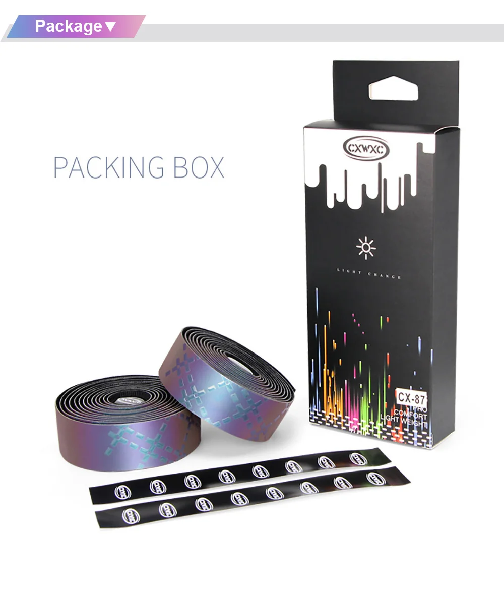 Модель: CX-85Время: 2019 НовинкаРазмер: Длина: 2200 мм, ширина: 30 мм, толщина: 2,8 ммМатериал: полиуретан + Эва + МикротексЦвет: оригинальный (черный), светоотражающий (Радужный) зависит от изменения светильникВес: около 130 г (вся посылка)Аксессуары: (лента для бара, заглушка для бара, изолента, короткая дополнительная лента) x 2