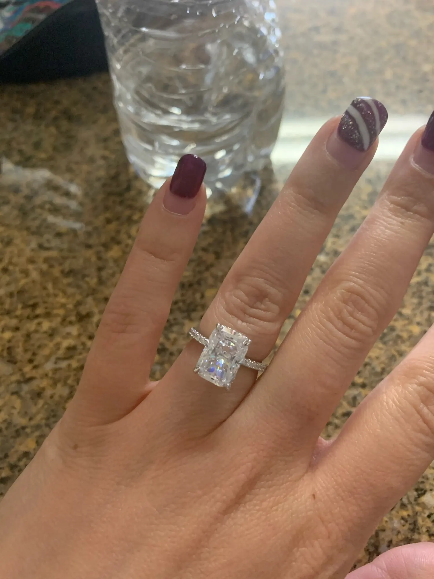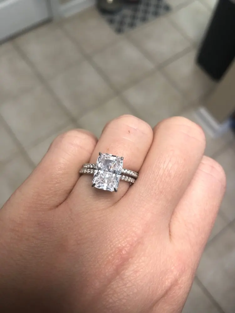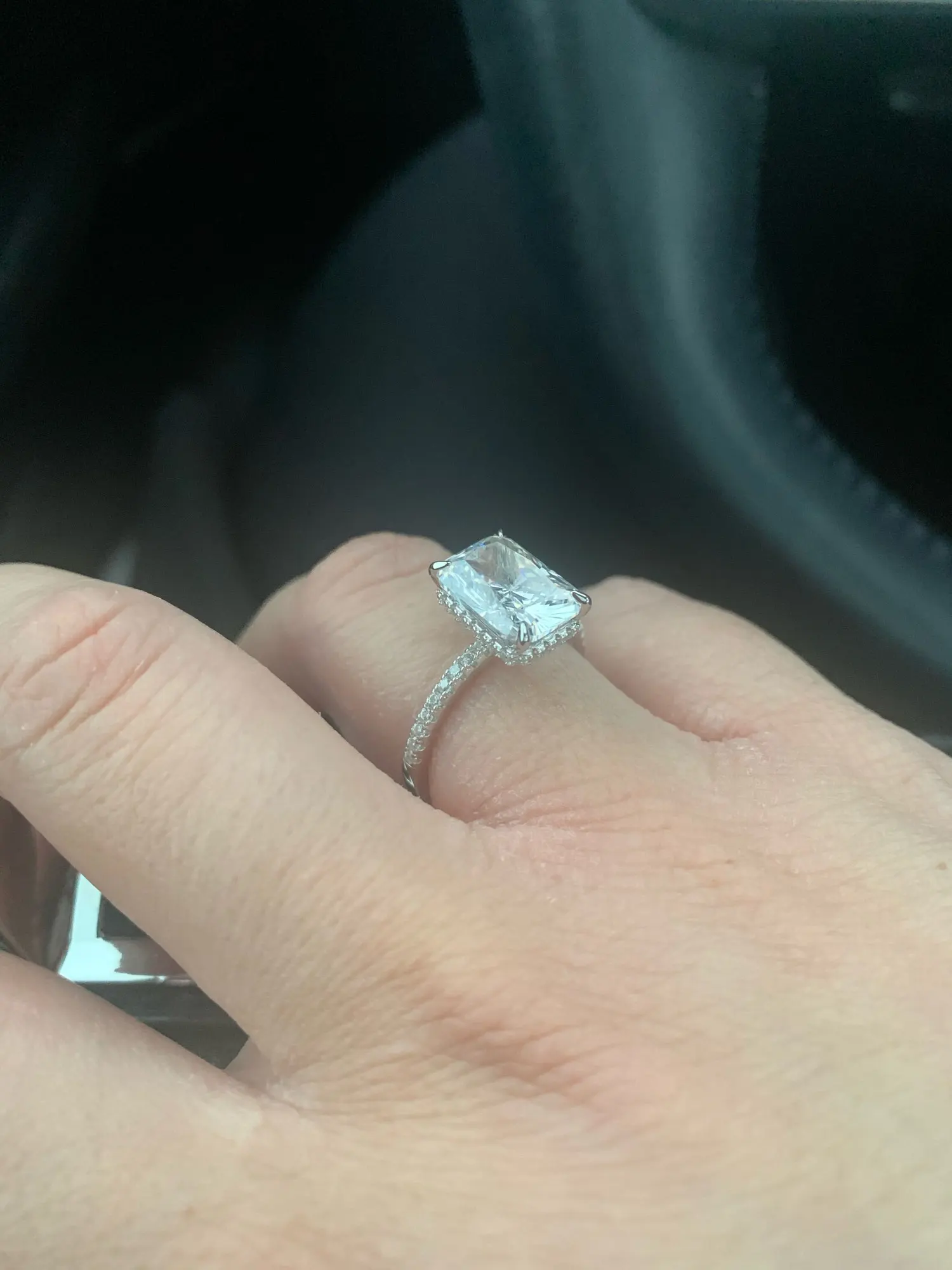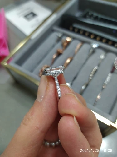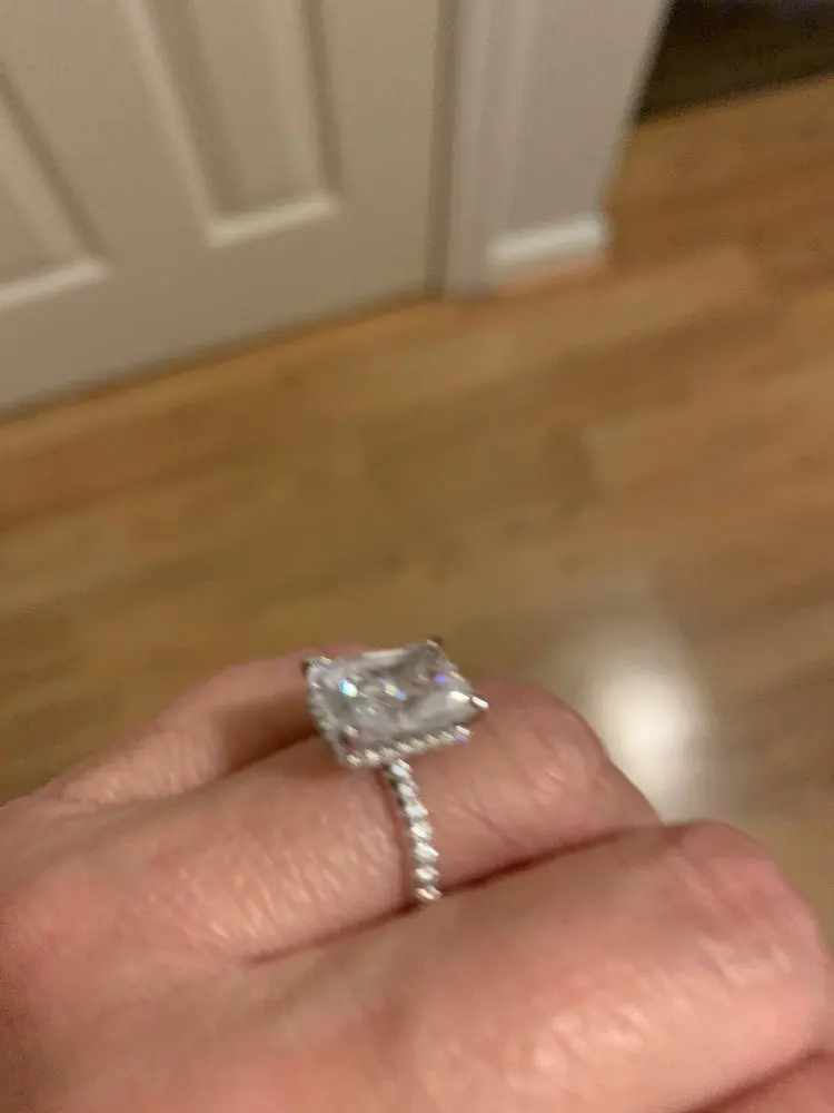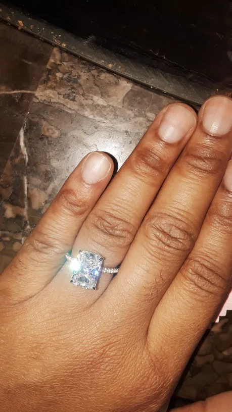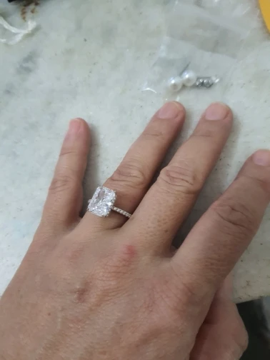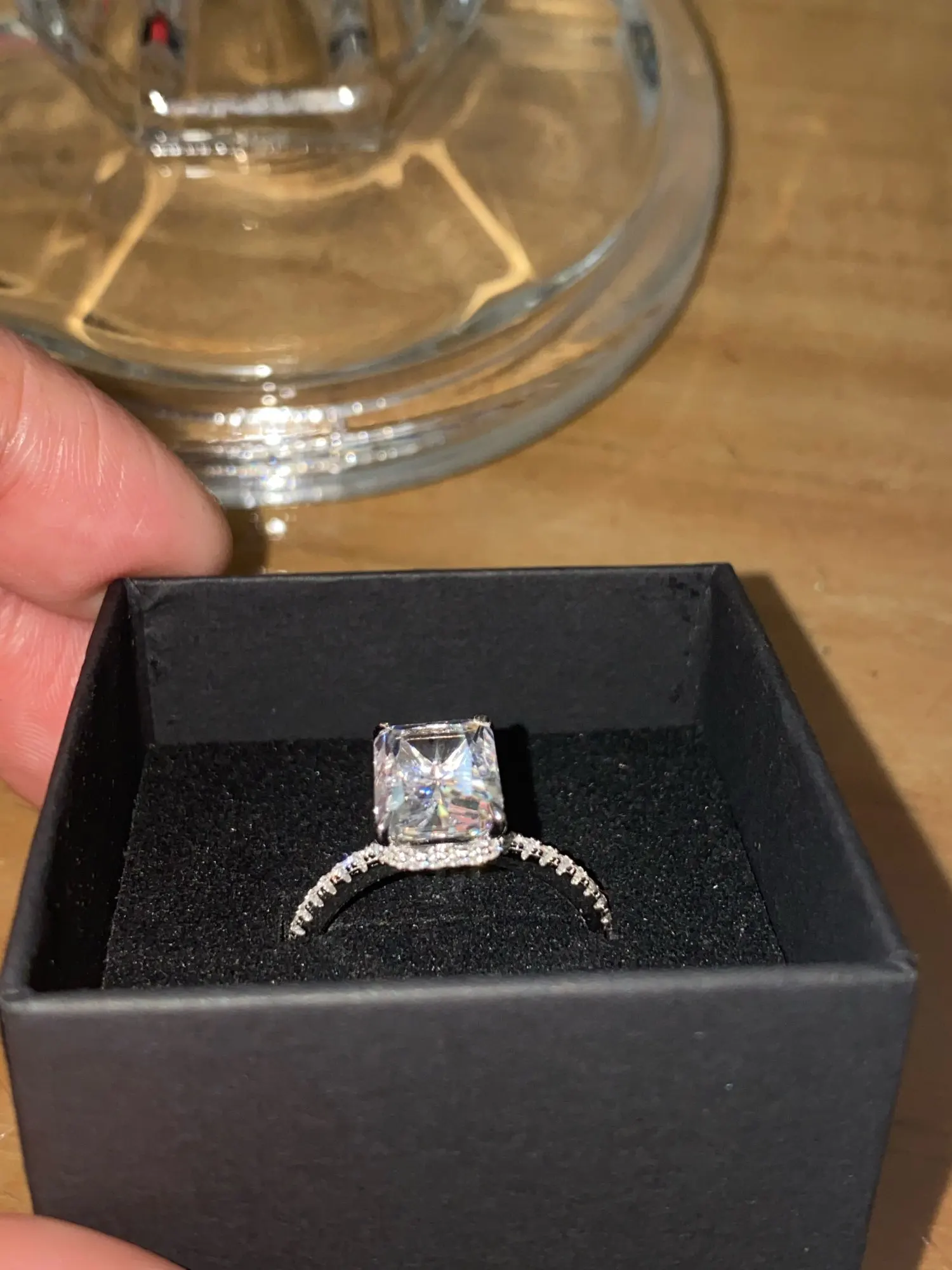 Выглядит потрясающе, моя жена была шокирована! На нем есть штамп из стерлингового серебра 925 пробы, и алмаз точно выглядит моиссанитом (не проверял тест на алмазы), отличное качество!