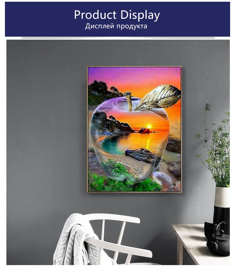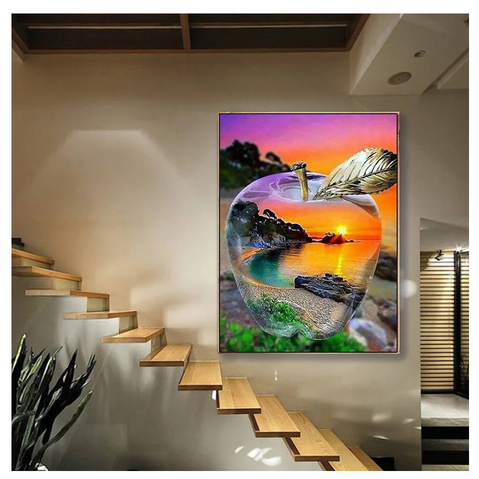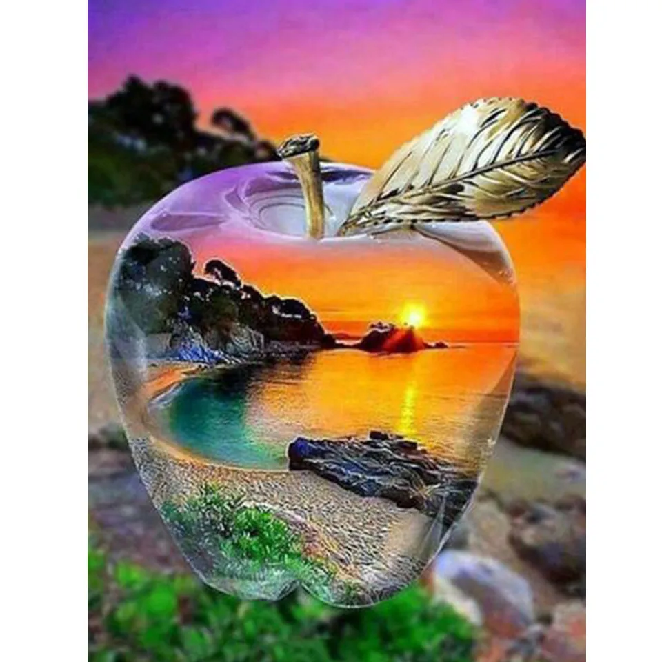 Полноформатнаякруглая Алмазная вышивка 5D с пейзажем, сделай сам, картина закат, яблоко, вышивка крестиком, мозаика, стразы, Декор