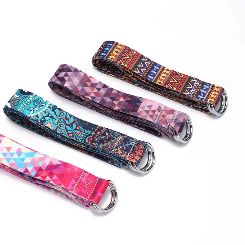 Хлопковый ремень для йоги с принтом, моющийся, D-образное кольцо, эластичный ремень для тренажерного зала, фитнеса, пилатеса, йоги, коврик для йоги, веревка, растягивающаяся лента