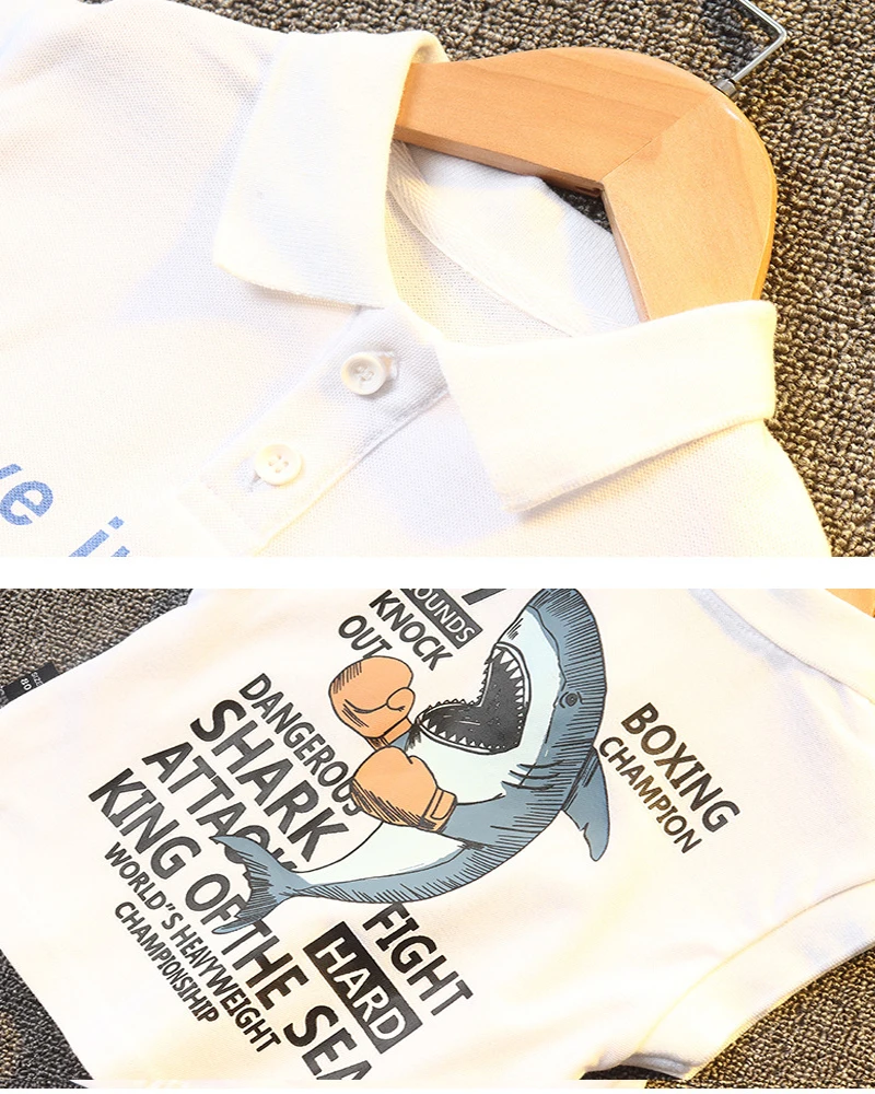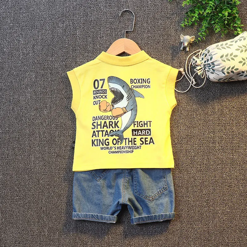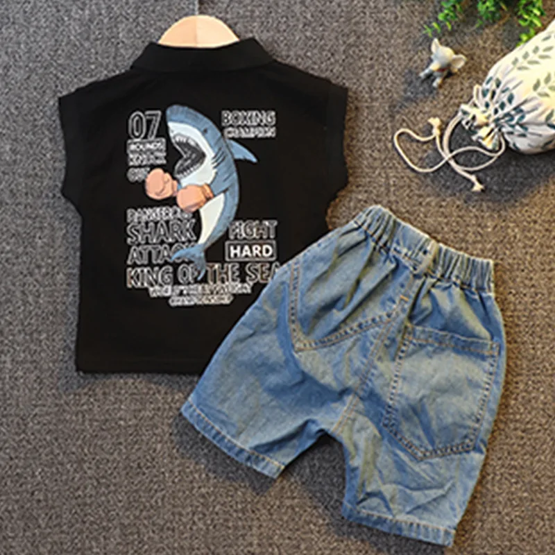 Костюм для мальчиков, летний костюм с коротким рукавом, из 2 предметов, мягкие джинсовые шорты, рубашка с акулой