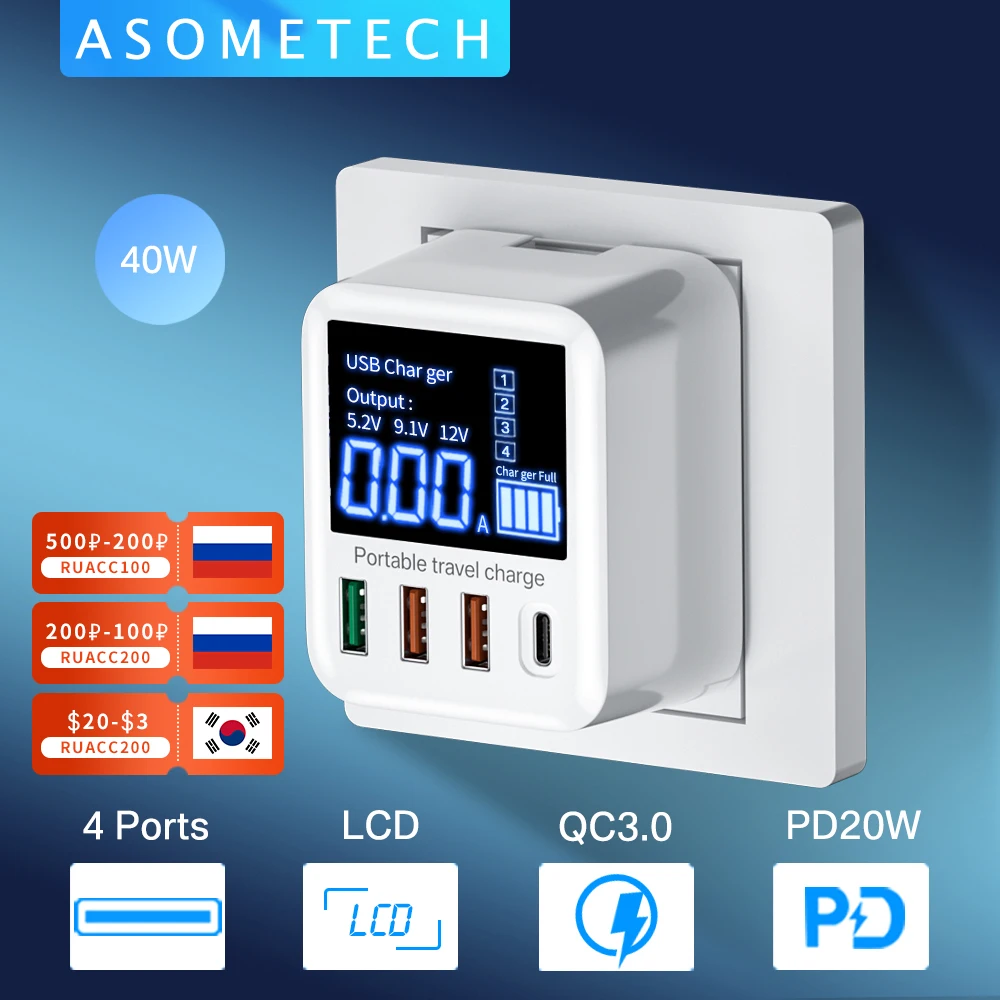 QC3.0 Быстрая зарядка USB C Зарядное устройство 4 порта Портативное зарядное устройство для телефона 30 Вт 40 Вт ЖК-дисплей для iPhone 12 Samsung Type C PD USB-зарядное устройство