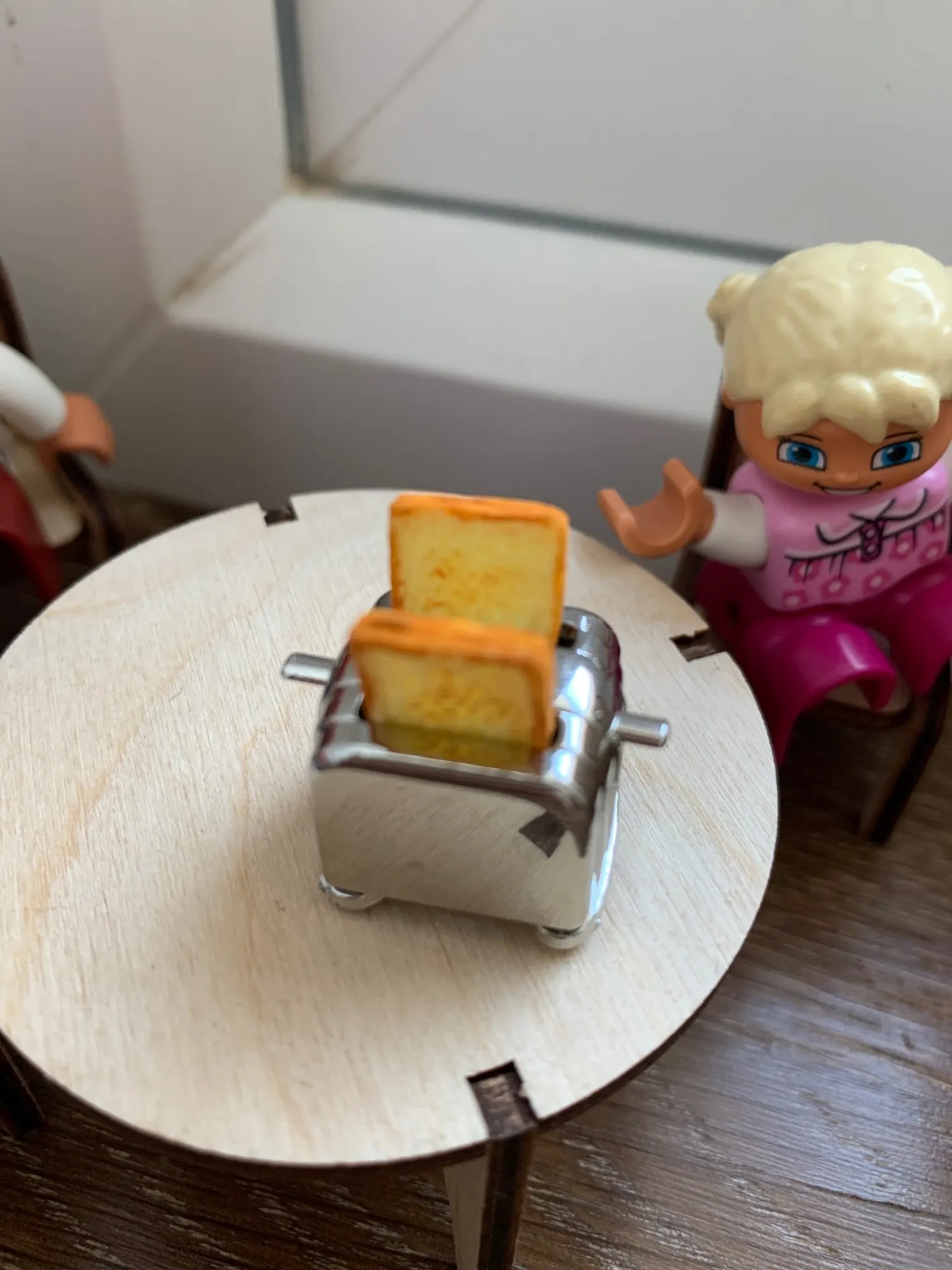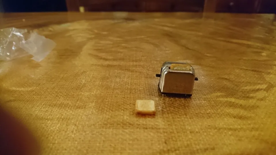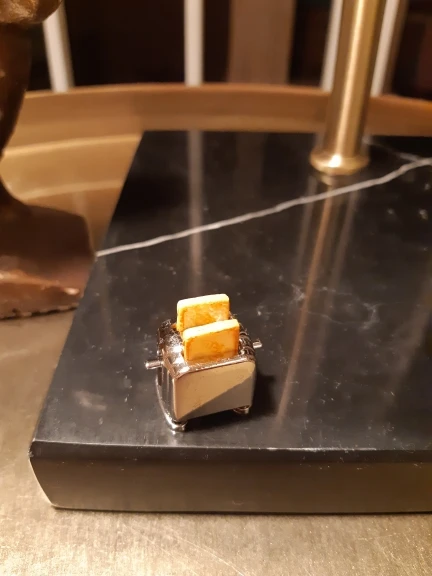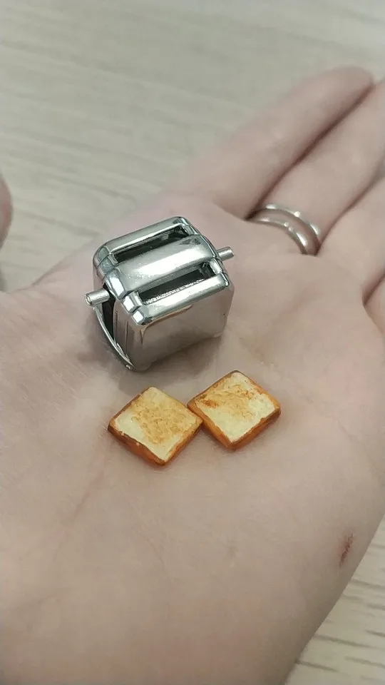 Очень маленький и красивый, тост соскальзывает с тостера, как настоящий, тостер сделан из металла и пластмассовых тостов. Идеально подходит для игрушек типа Барби, Playmobil, семьи сильваня. И т. Д.