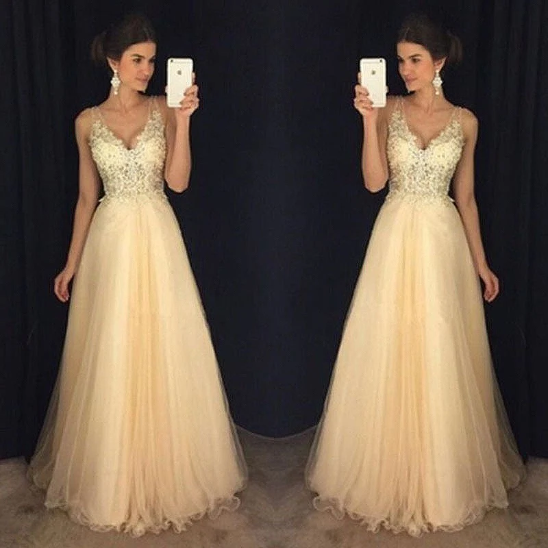 Женское длинное вечернее платье цвета шампанского, с V-образным вырезом, без рукавов