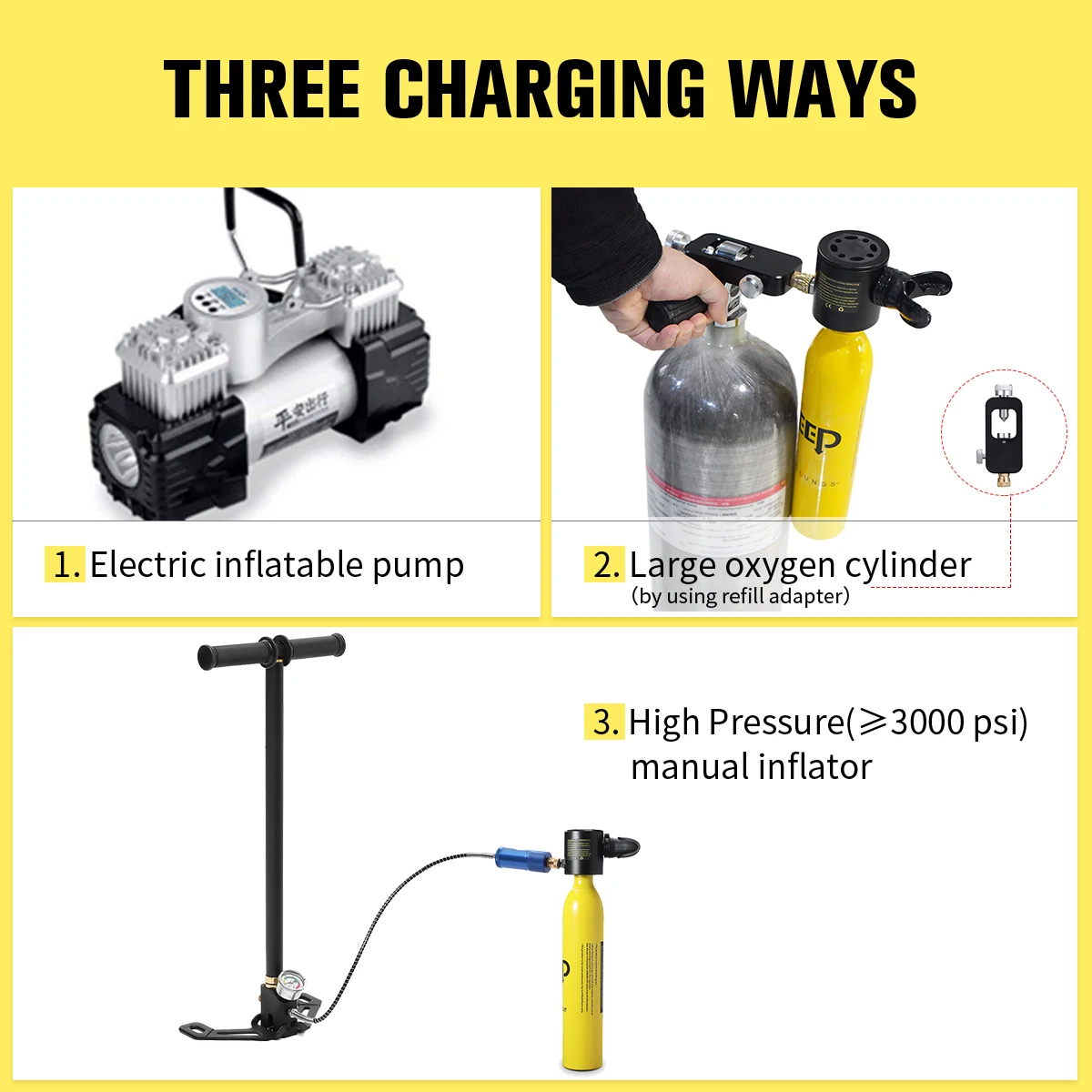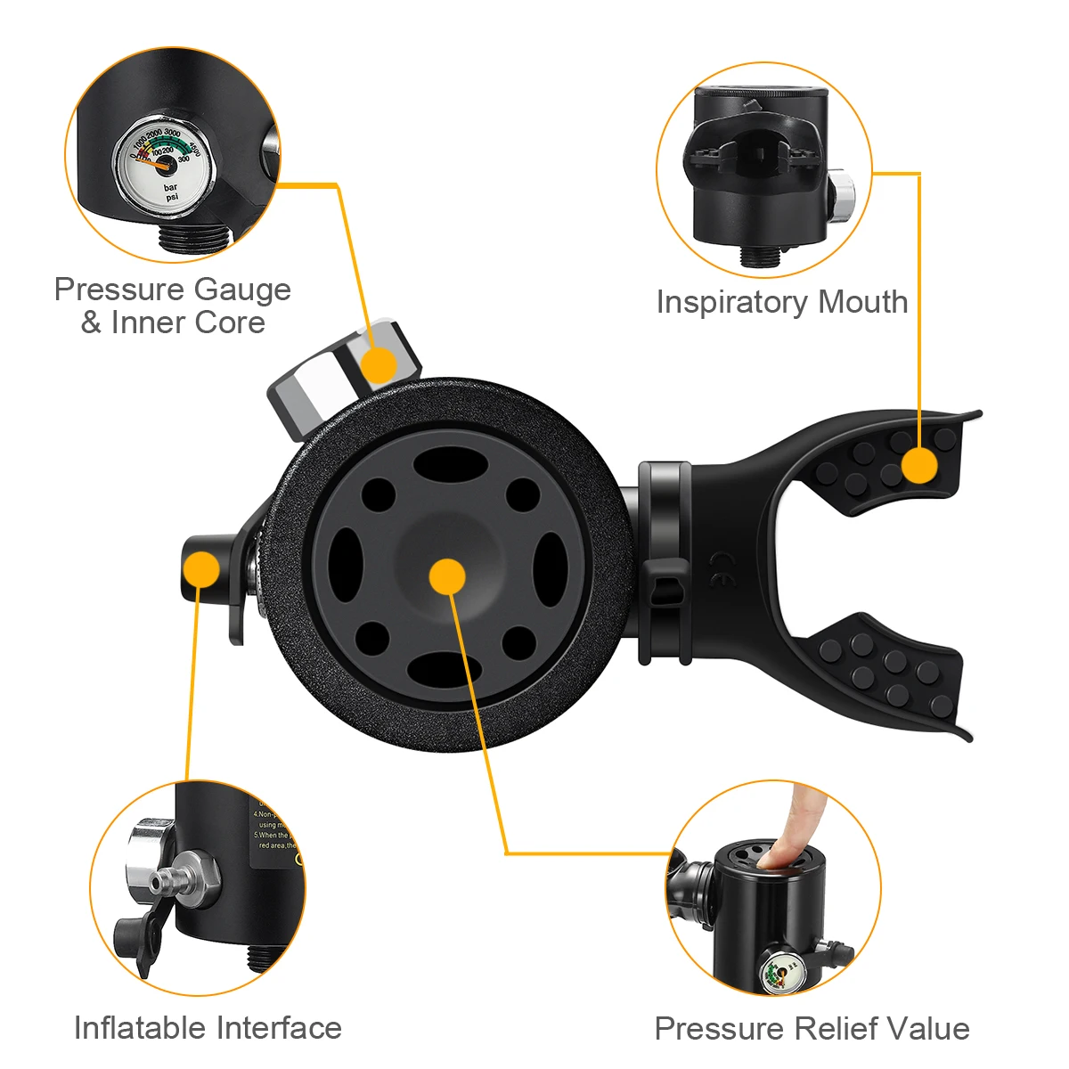 Изображения основаны на реальных товарах, Все права защищены. Посылка входит:1 x 0,5л диглубинный кислородный баллон1 x сумка для респиратора1 х поводок безопасности1 x набор аксессуаров1 x адаптер для заправки кислородного баллона1 x Руководство пользователя Особенности:1. Кислородный баллон объемом 0,5 л Позволяет водолазу оставаться на 1-10 метров под водой в течение 5-12 минут (в зависимости от индивидуальной емкости легких и глубины погружения), идеально подходит для новичков.2. Поддерживает 3 типа накачивания: ручной насос высокого давления, переключатель aqualung, электрический насос. (насос накачивания не входит в комплект)3. Используется алюминиевый материал 6061T6 и соответствует стандартам производства оборудования для дайвинга.4. Поставляется с манометром, чтобы показать, сколько воздуха находится в резервуаре для дайвинга.5. Оснащен эргономичным силиконовым мундштуком.6. Нажмите и удерживайте верхнюю часть для вентиляции пресс ure внутри бутылки.7. Легкая и портативная конструкция, ее можно взять на борт после поворота дыхательного клапана. Характеристики:Дыхательный кислородный баллонЕмкость: 0,5 лМатериал: авиационный алюминийВес кислородного баллона: 1300 гМаксимальная емкость: 3,0 куб. Футов/85 литровДлина: 13,4 " / 34 смДиаметр: 2,25 "/5,7 смМаксимальное давление: 3000psi/200 бар/20 МПаПоверхностные вдохи: 57Макс. Время пребывания под водой: 12 минутВремя накачивания: 7-10 мин Профилактическая мера Предупреждение1. Этот продукт подходит для рекреационного дайвинга на расстоянии 10 метров. Не пытайтесь использовать его в качестве подачи воздуха в более глубоких водах.2. Этот продукт может быть использован в качестве резервного источника воздуха для рекреационного погружения на глубину до 30 метров. Перед использованием данного продукта необходимо пройти обучение и сертификацию аккредитованного учреждения технологии подводного плавания. Использование этого дыхательного аппарата несанкционированным человеком на глубине более 10 метров может привести к опасности.3. Данный продукт подходит для использования в водах, которые выше 10 градусов Цельсия.4. Рекомендуемая максимальная скорость подъема 15 метров в минуту (последние 6 метров должны быть 6 метров в минуту).5. Не переносите изделия с признаками повреждений, протекания или нежелательной работоспособности.6. Максимальное давление наполнения этого продукта составляет 3000PSI, и он не может использовать наполненный тем газом с содержанием кислорода более 40%. Используйте чистый и сухой сжатый воздух, не подвергайте продукты воздействию выше 160 градусов Цельсия или открытого огня.7. После наполнения воздуха необходимо сначала сбросить давление.8. Пожалуйста, Потренируйтесь на мелководье в первый раз. Использование этого продукта требует от двух или более человек, чтобы сопровождать вас.9. Когда указатель прибора приближен к красной зоне, прекратите погружение в воду. Перед повторным использованием необходимо надуть.10. Храните изделие в сухом прохладном месте, Избегайте попадания прямых солнечных лучей, багажа или экстремальных температур.11. Этот продукт является продуктом высокой точности, пожалуйста, не разбирайте и не собирайте этот продукт по желанию. Неподготовленная дополнительная разборка этого продукта может привести к повреждению продукта. Примечание:О проблемах послепродажного обс