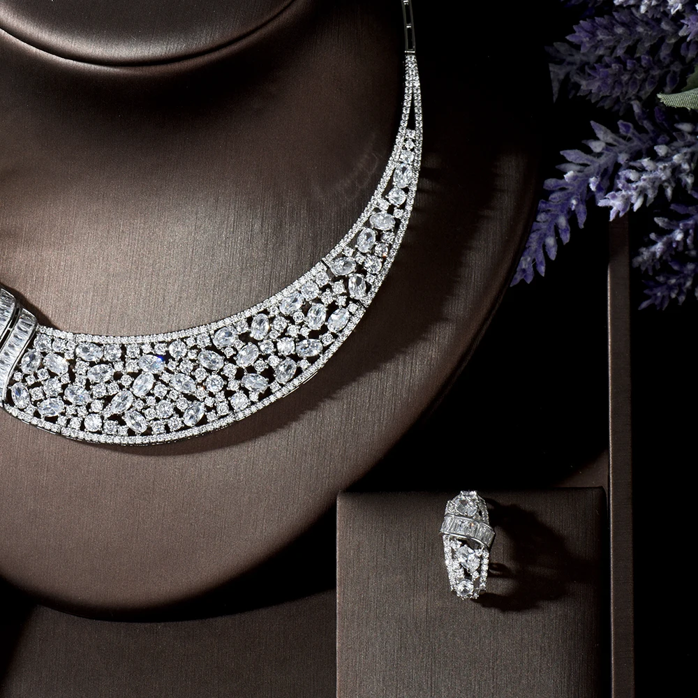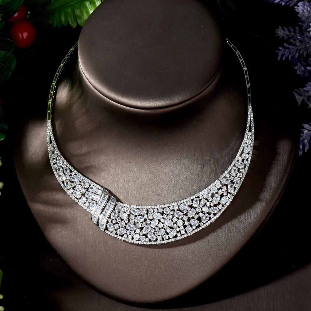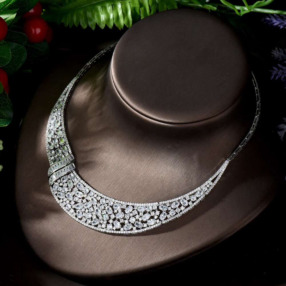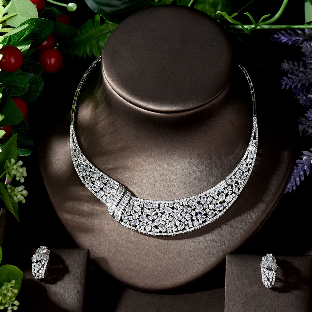 HIBRIDE Блестящий Белый Цвет кубический цирконий большой тяжелый свадебный ожерелье комплект ювелирных изделий для невесты свадебное платье аксессуары