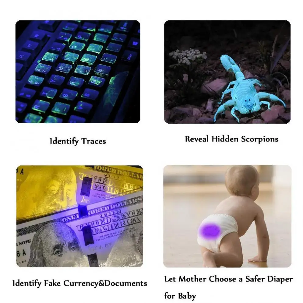 Функции:-Обнаружение пятен крови, пятен пищи или мочи домашних животных на ковре или других поверхностях.-Идентификация поддельных банкнот, штампов, ярлыков с защитой от подделок и официальных удостоверений личности, таких как паспорта и удостоверения личности.-Охотничьи скорпионы и другие насекомые.-Осмотр гостиничного номера: Используйте УФ-светильник для обнаружения ошибок в кровати и убедитесь, что комната чистая и безопасная.-Поиск минералов на открытом воздухе (освещает флуоресцентные минералы).-Обнаружение грызунов, поиск мышей или крысиных капель и мочи.-Проверка ремонта или трещин в антикварном фарфоре, ювелирных изделиях или стеклянной посуды.-Проверка утечки автомобильной и промышленной жидкости.