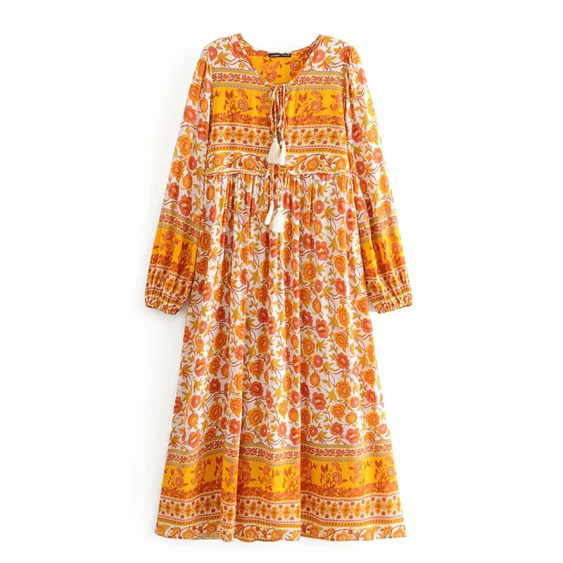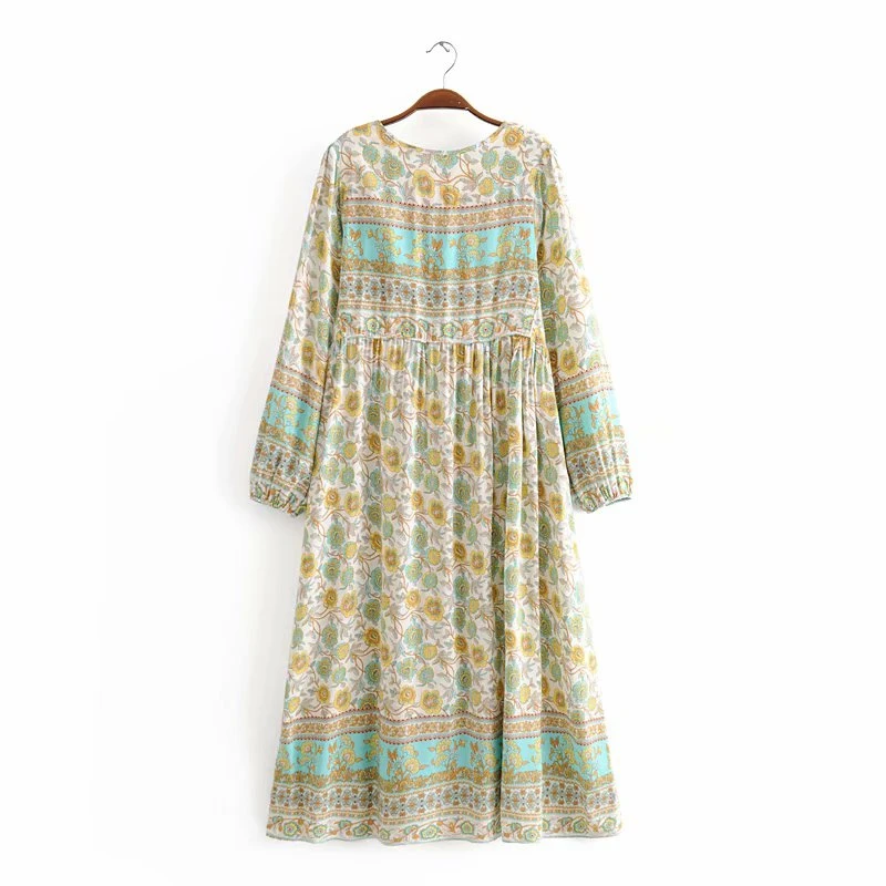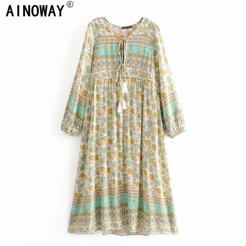 Винтажное шикарное женское пляжное платье миди с длинным рукавом и цветочным принтом, женское платье с бантом на шее, вискозное плиссированное платье в стиле бохо, платья