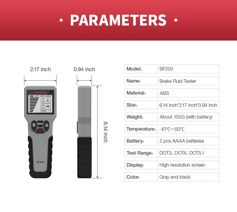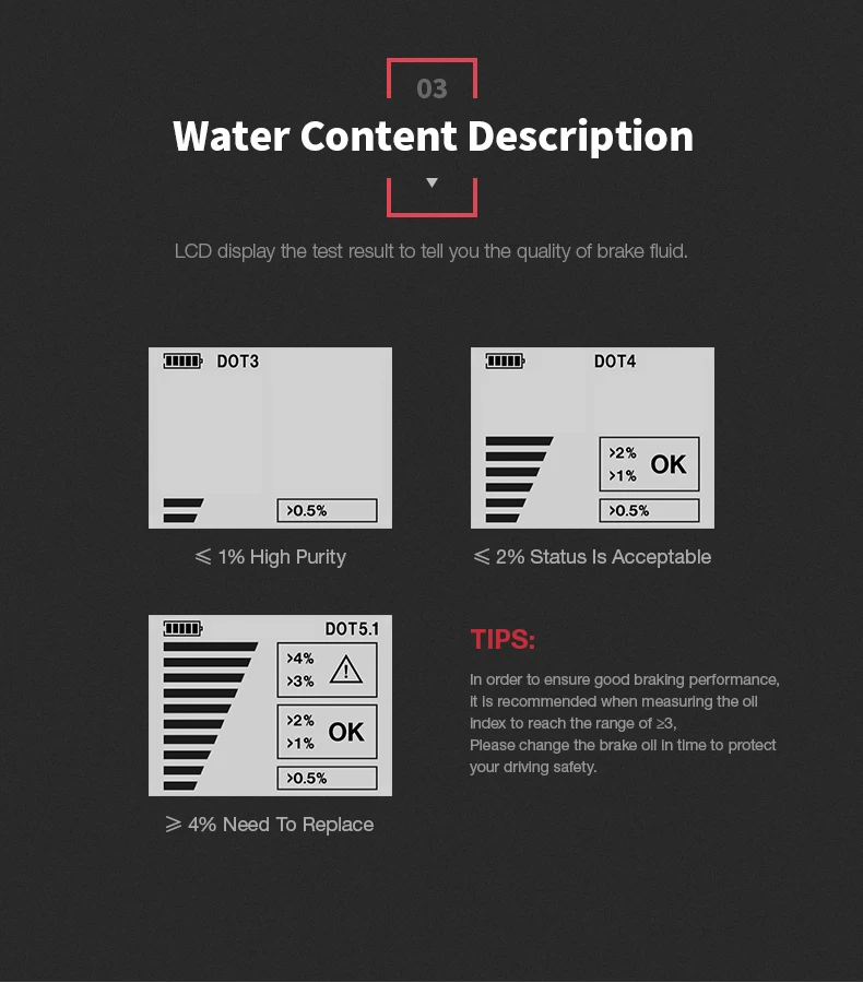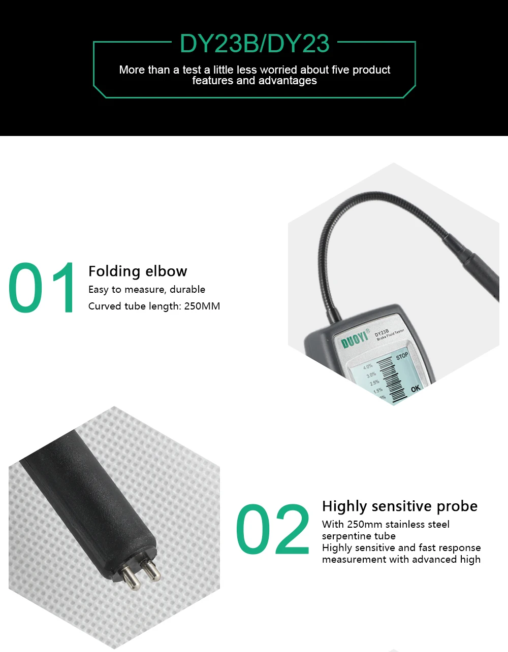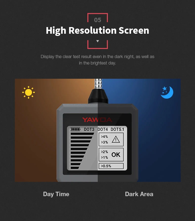 Тормозное давление было передано тормозной жидкостью, передача давления будет отключена после того, как Тормозная жидкость, включая слишком много воды. Для безопасного вождения необходимо регулярно тестировать шкалу соотношения воды в тормозной жидкости. Тестер тормозной жидкости помогает нам выполнять текущее техническое обслуживание, убедитесь, что мы движемся в безопасном состоянии.