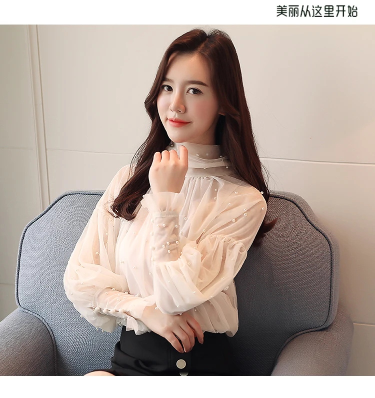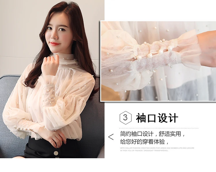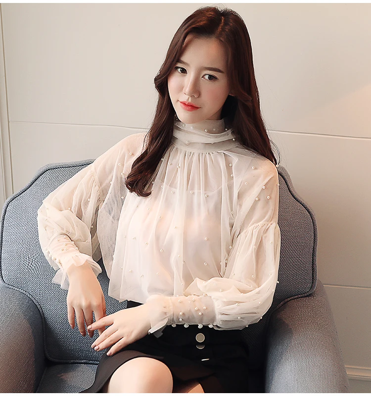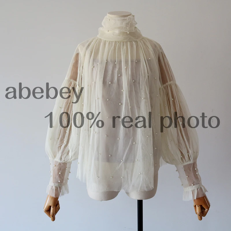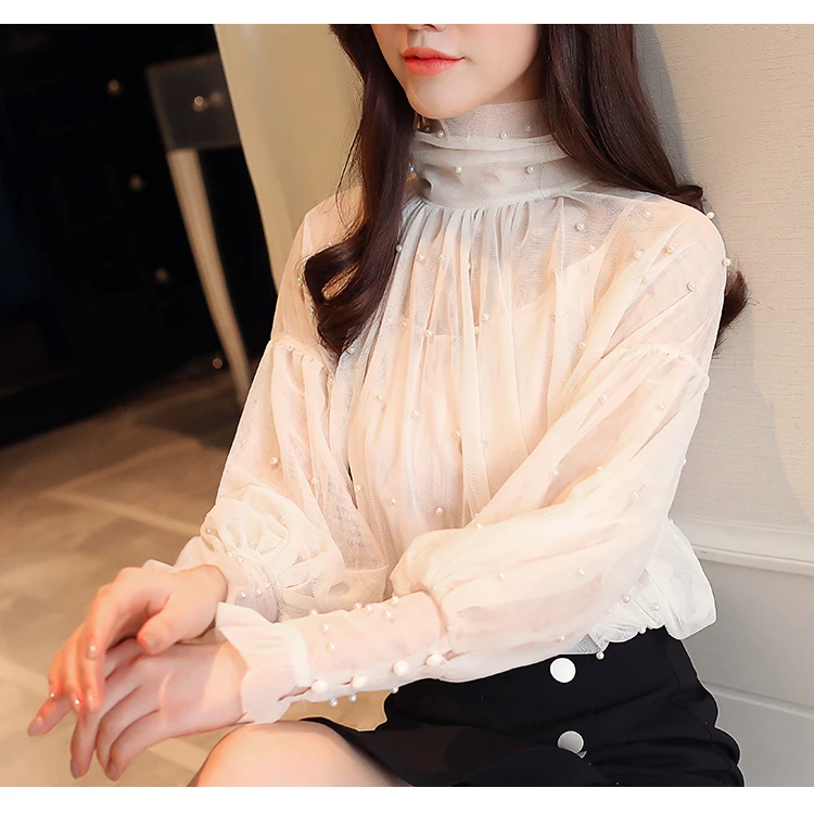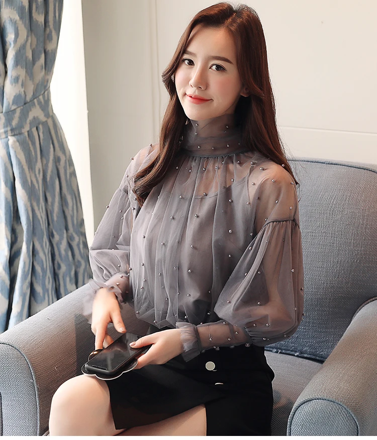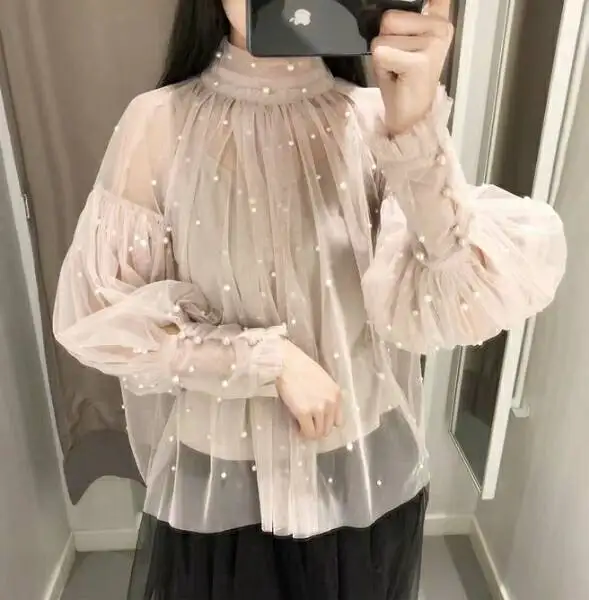 Женская сетчатая блузка с бусинами, Элегантная блузка из сетчатой ткани с пуговицами из жемчуга, Новинка осени 2022