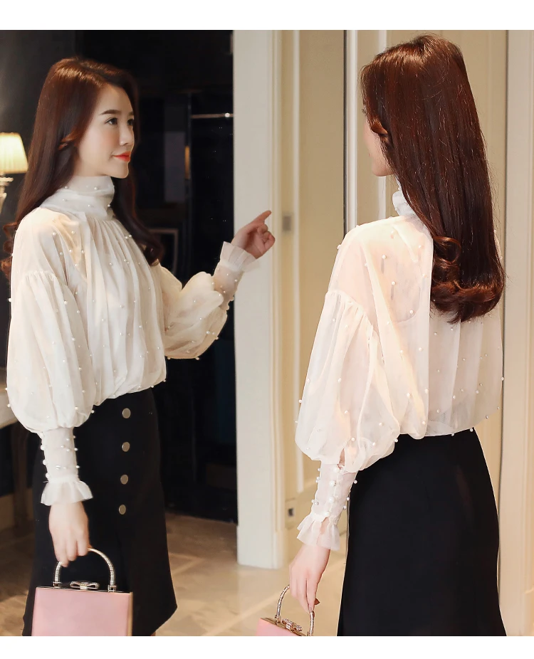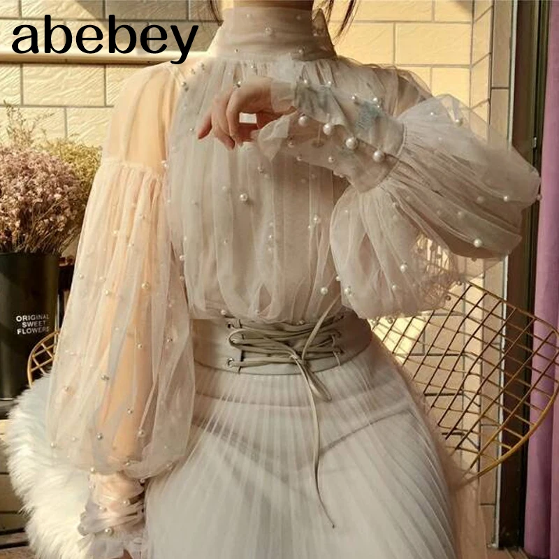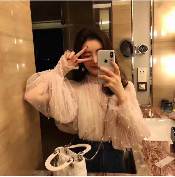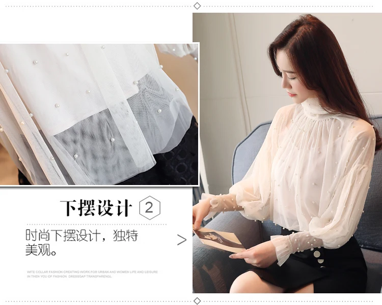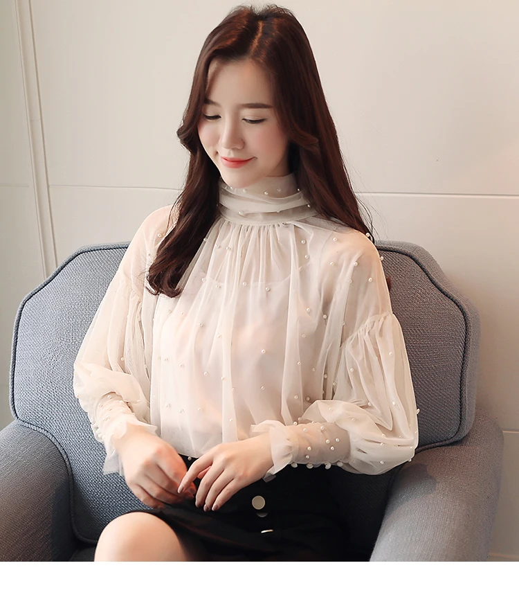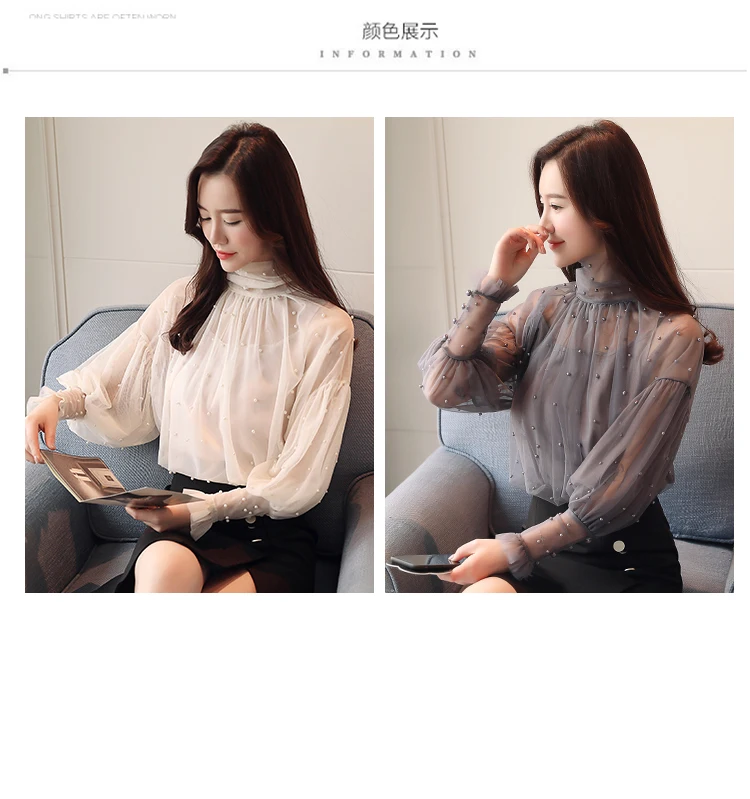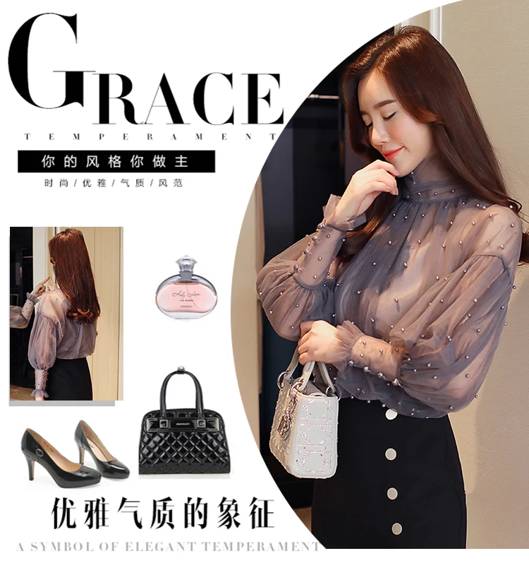 Женская сетчатая блузка с бусинами, Элегантная блузка из сетчатой ткани с пуговицами из жемчуга, Новинка осени 2022