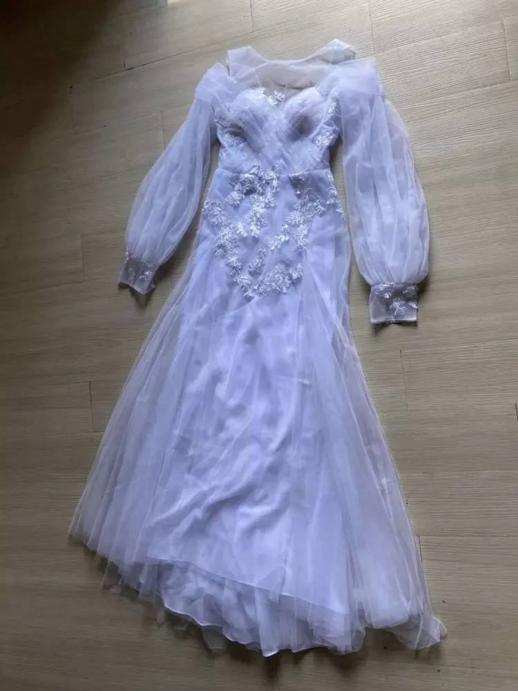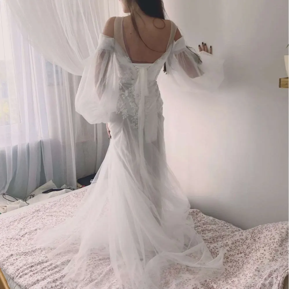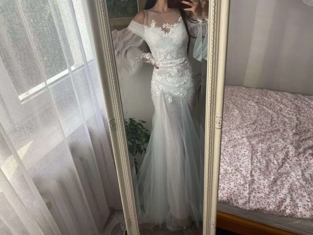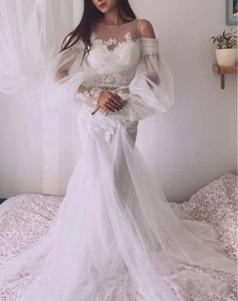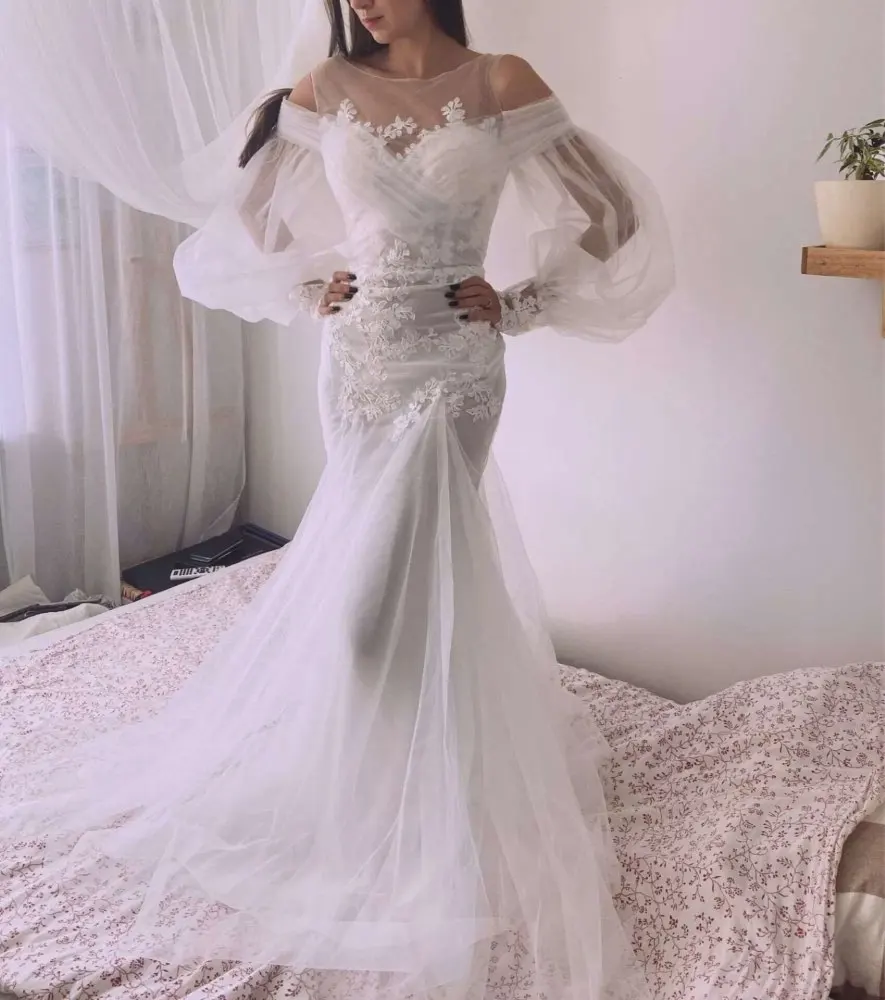 Платье женское свадебное кружевное с длинными рукавами-фонариками и...