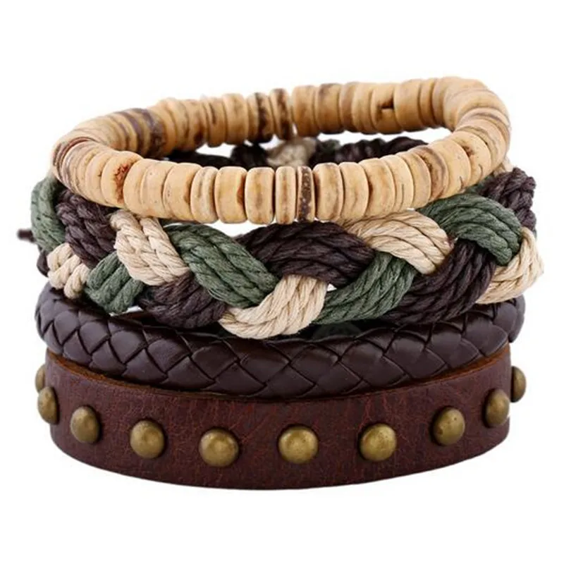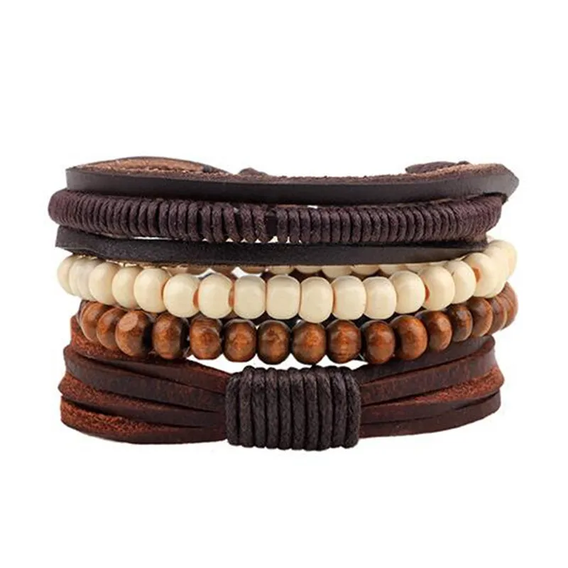 Браслет мужской кожаный, многослойный, ручной вязки, с перьями и камнями, винтажный, браслет из деревянных бусин