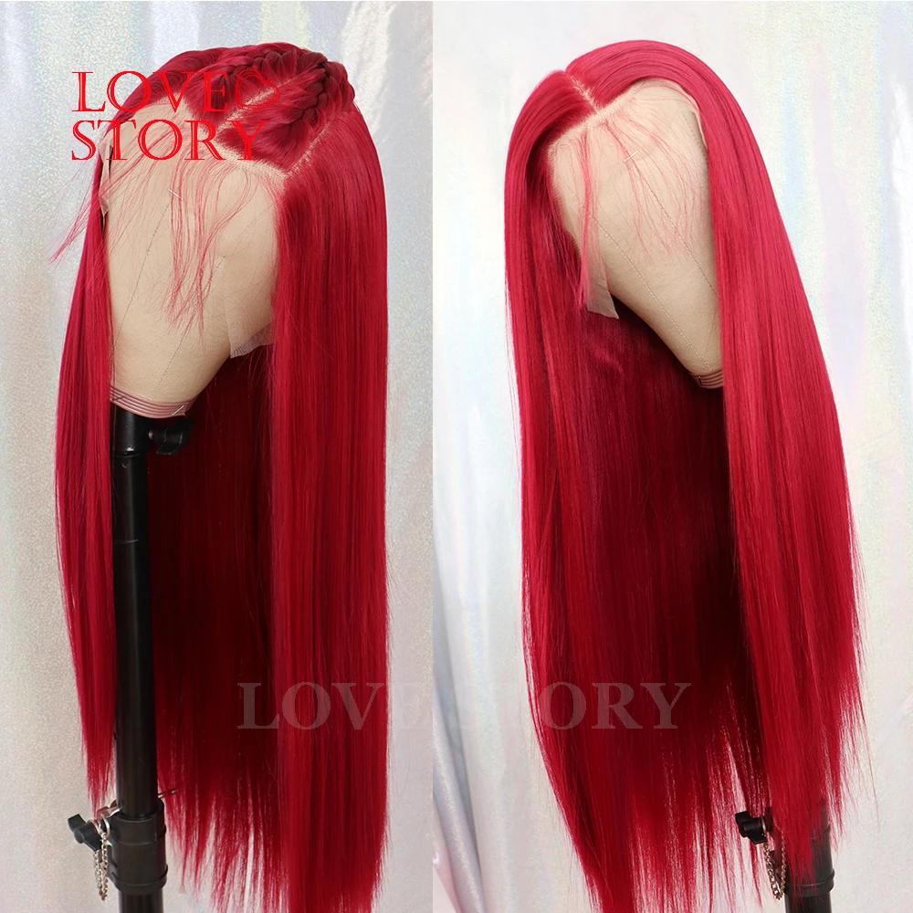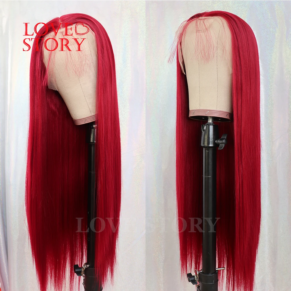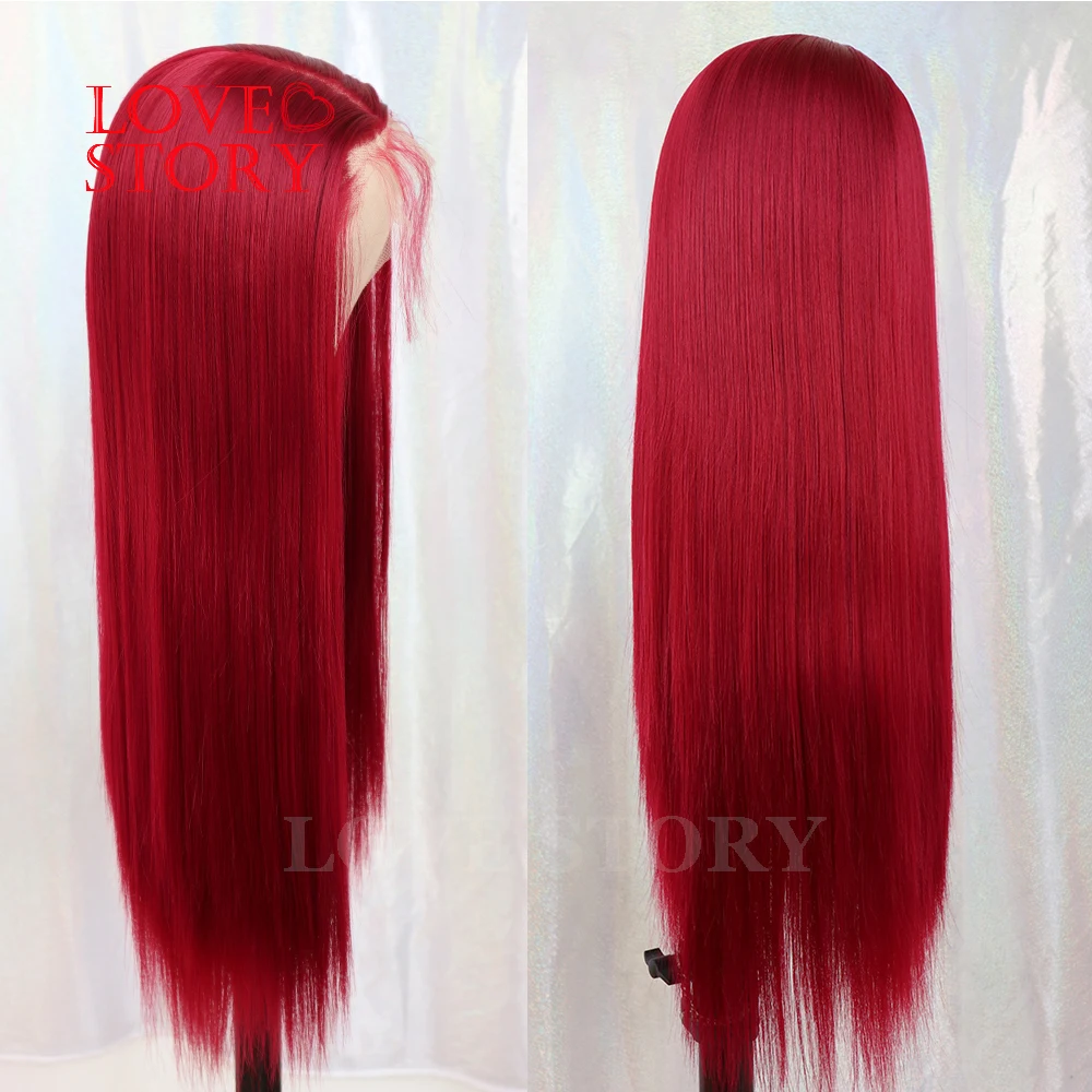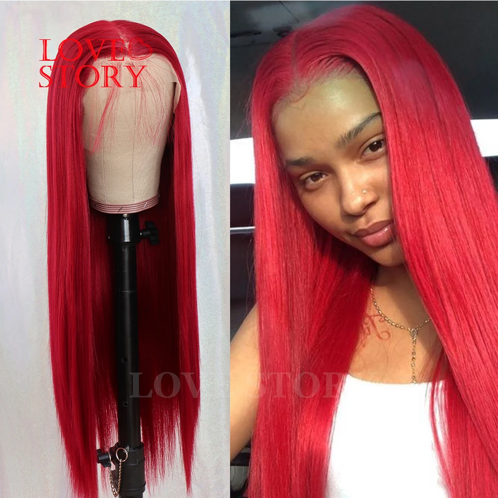 Ловестори 13*6 шелковистые прямые синтетические кружевные передние парики красный цвет средняя часть термостойкие волокна синтетические волосы парик шнурка