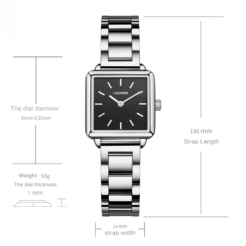Размер циферблата: 25 мм X 25 мм Толщина циферблата: 7 мм Ширина ремешка: 14 мм Длина ремешка: 190 мм Г: 63 г (Указанные выше данные измеряются вручную с небольшой погрешностью.)