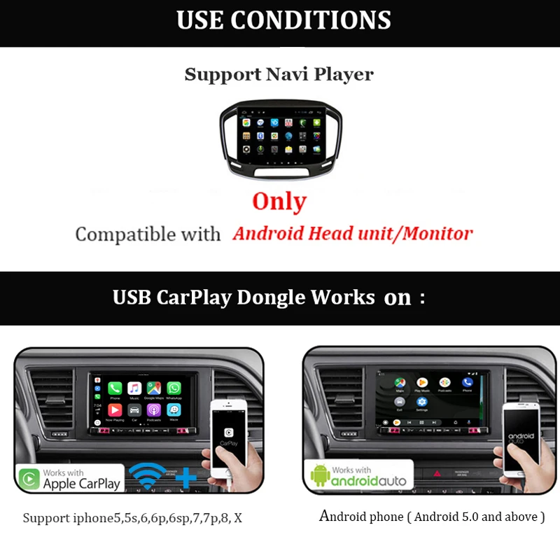 Функция Prouduct: Голосовое управление: -Поддержка Siri/музыка/карты/телефонные звонки/сообщения/аудио книги. -Функция Siri поможет вам позвонить Розе или любому из ваших друзей. -Пожалуйста, обратите внимание, что скорость работы нашего устройства зависит от скорости вашего телефона на ios. Сенсорный экран и hd-дисплей: -Направленное управление и просмотр телефона на автомобильном навигационном экране с помощью usb-кабеля. Свободные руки и безопасное вождение: -Совершать/отвечать на звонки, проверять голосовые сообщения, текстовые сообщения и создавать карты. -Слушайте ваши любимые песни с помощью приложений в формате «hands free», «Apple Music» или «Apple Music». Как установить APK? APK: http:/121.40.123.198:8080/AutoKit/AutoKit.apk 1. Установите Apk для продукта в головном устройстве Android. 2. Подключите продукт к usb-порту головного устройства Android. 3. Затем подключите оригинальный usb-кабель сотового телефона к usb-порту продукта. 4. Автомобильное радио войдет в интерфейс CarPlay. Описание: Цвет: белый Материал: пластик Навигационный плеер: система Andriod 4,2 или выше Мобильный телефон: iPhone iOS7.1 и выше; Android phone 5,1 и выше. Примечание: Этот продукт не совместим с оригинальным мультимедийным проигрывателем автомобиля! Посылка включает в себя: Беспроводной usb-ключ CarPlay-1 шт. 1 X Руководство пользователя
