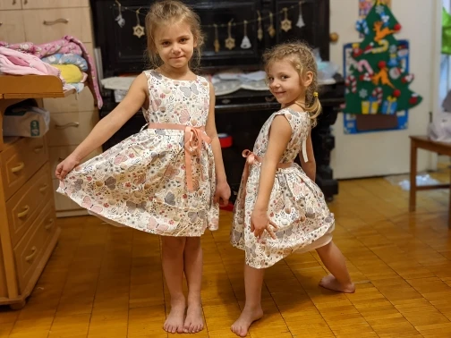 Платье хорошее, нитки не торчат, приятное к телу. У дочки рост 91 см (2.7 года),взяла на размер 4Т село идеально. Смотрится очень красиво.