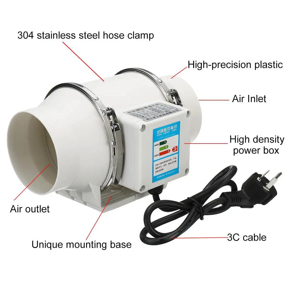 Особенности:-Цвет: белый-Шум: 34-43дб-Скорость вентилятора: 2600 об/мин-Напряжение: 220 В, 50 Гц-Мощность: 40 Вт, 75 Вт, 130 Вт-Материал: ABS (акрилонитрил бутадиен стирол) + сталь-Вилка: вилка стандарта Австралии (отправляется с адаптером в соответствии с вашей страной)-Вытяжка Воздуха: 320 м/час (4 ''), 540 м/час (6''), 900 м/час (8 '')-Длина: ок. 22-30-32 см/8,66-11,81 ''-12,60''(4 ''-6''-8 '')-Диаметр: 4 ''(100 мм), 6''(150 мм), 8 ''(200 мм)-Легко устанавливается и моется.-С вилкой, устанавливается гибко.-Специально разработана для выращивания в помещении.-Очистка и удаление пыли, быстрая вентиляция.-Соответствует всем строительным нормам для ванных комнат, туалетов и влажных помещений.-Монтируется на стену/окно, подходит для кухни, ванных комнат, туалетов, спальни, гостиной и офисной вентиляции.