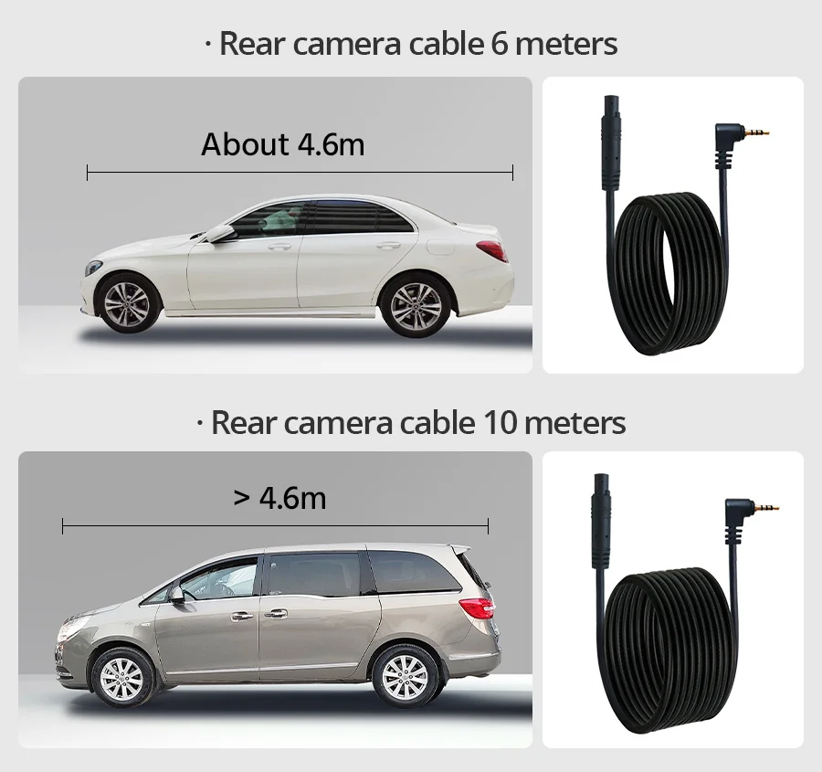 О выборе длины кабеля задней камерыЕсть 2 длины задней камеры (до около 10 метров) можно выбрать, подходит для автомобилей различной длины. Пожалуйста, выберите заднюю камеру в соответствии с длиной вашего автомобиля. Если вы хотите купить камеру заднего вида на 10 метров, пожалуйста, свяжитесь с нами.