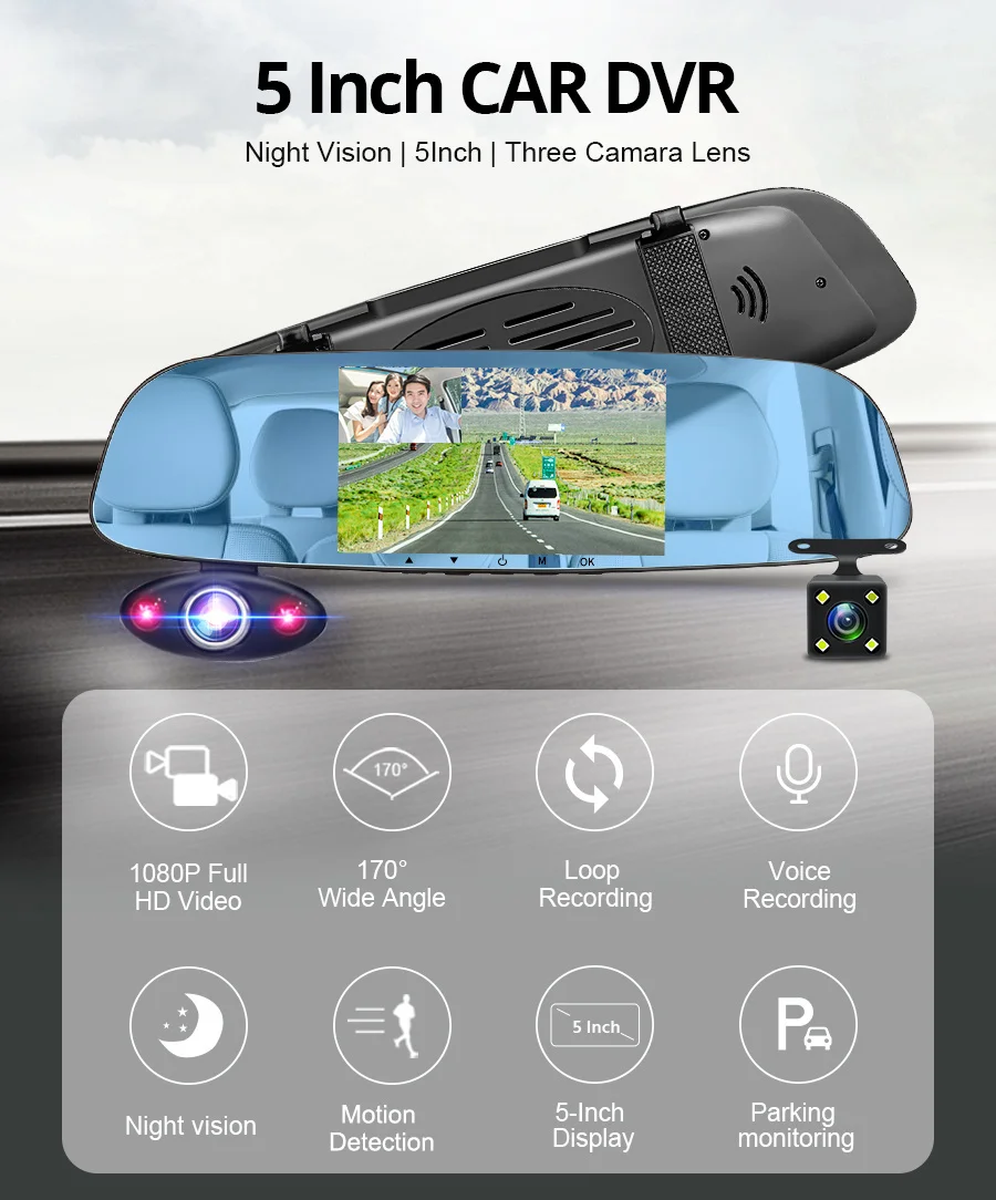 Дропшиппинг Автомобильное зеркало заднего вида Dvr 5 дюймов зеркало заднего вида FHD видео рекордер 3 камеры HD объектив Dashcam с камерой заднего вида