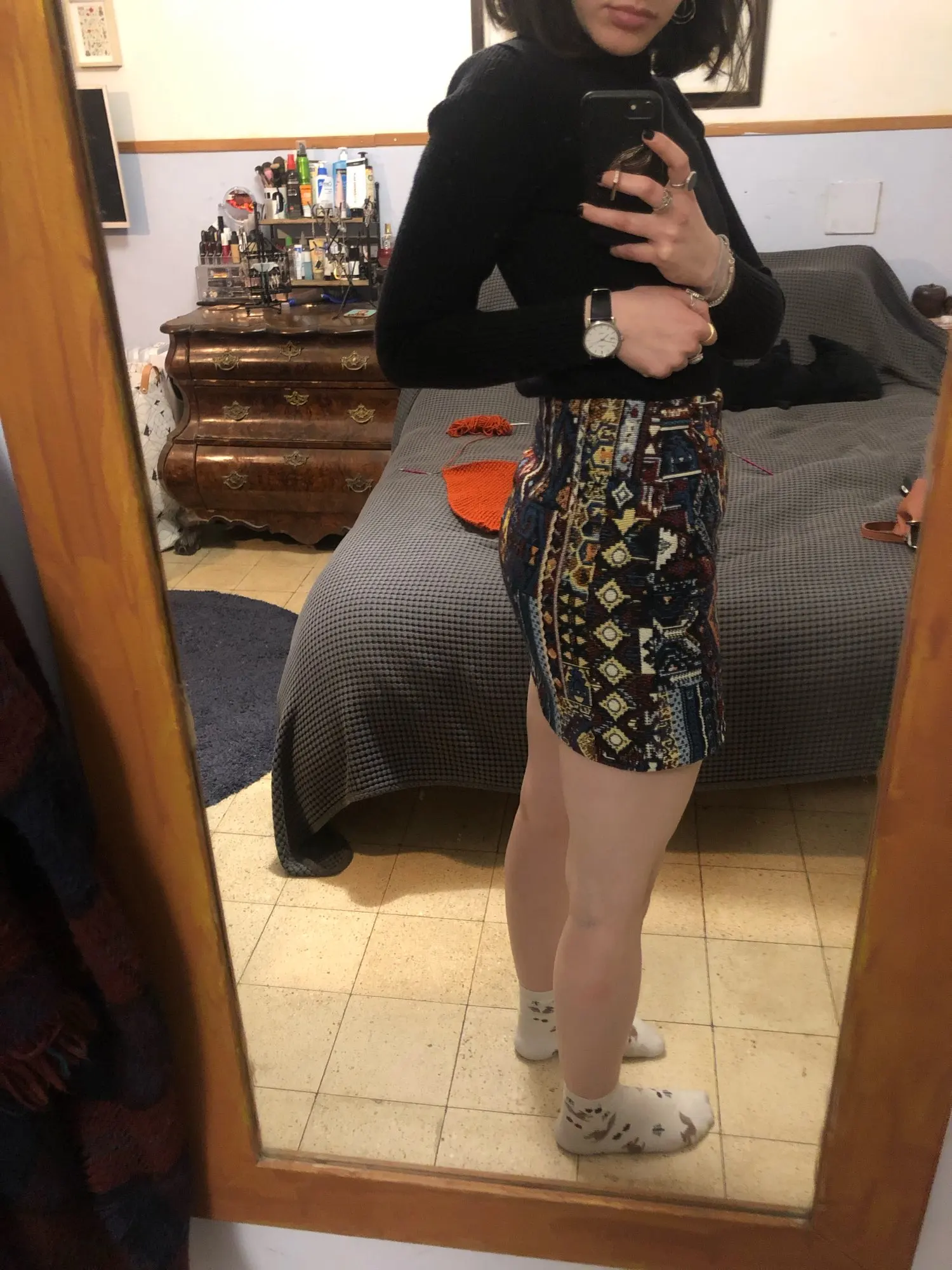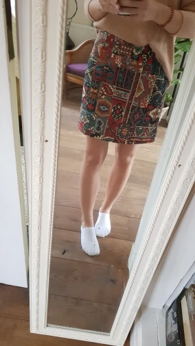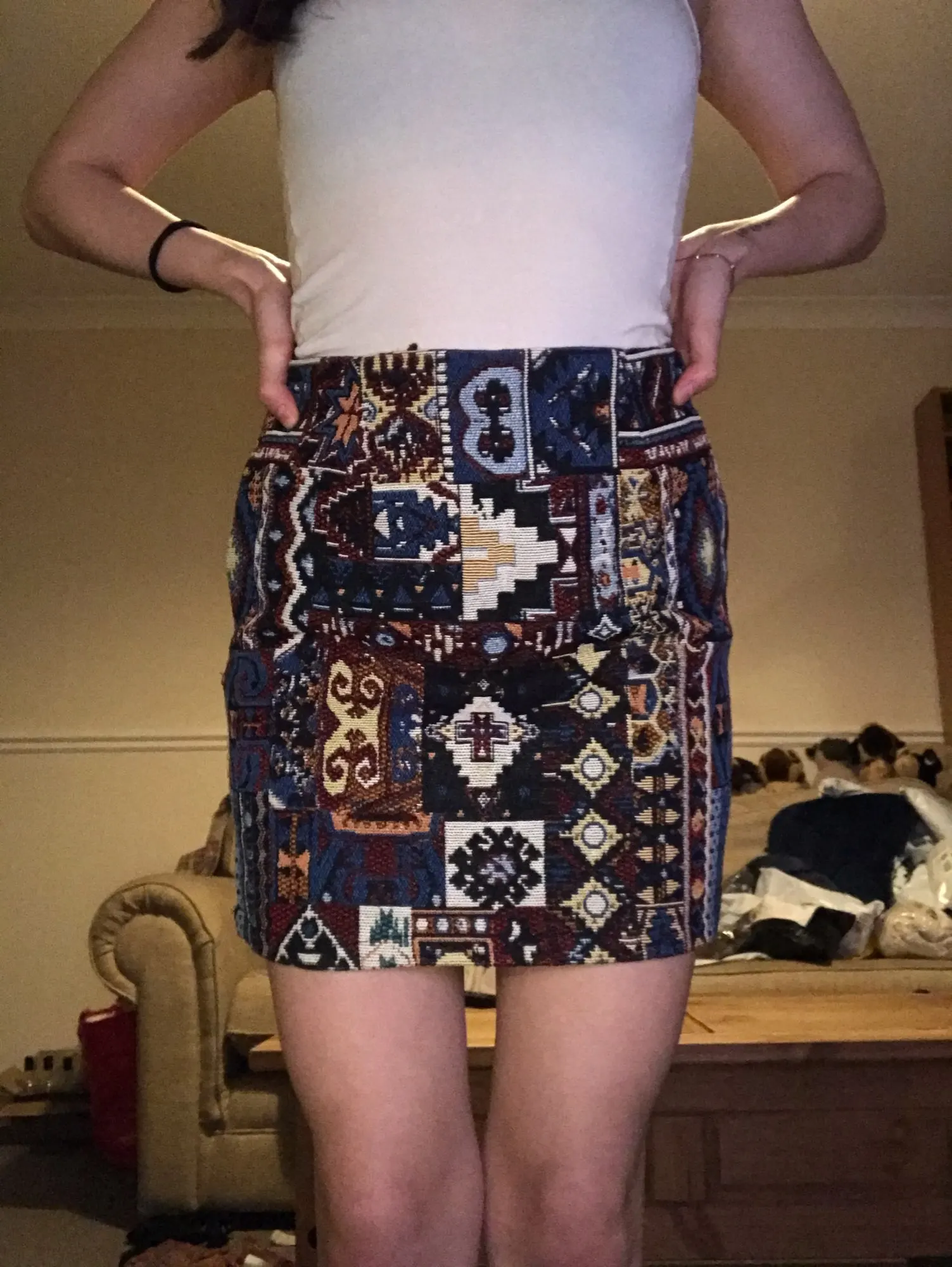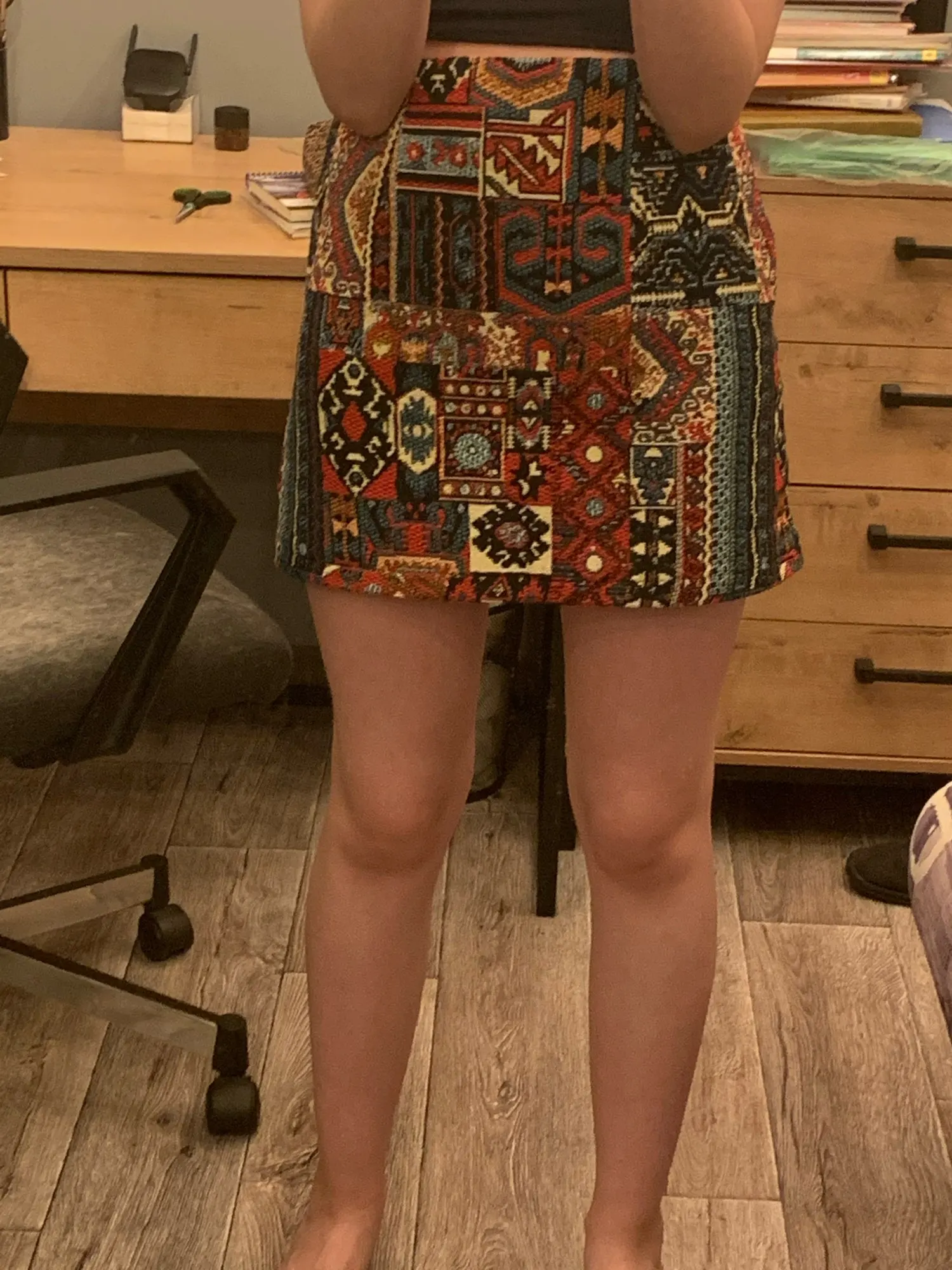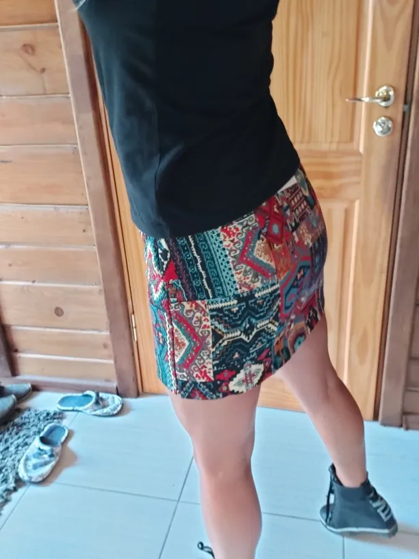 Красивая юбка, но немного великовата. Длина идеально подходит для моего роста 172 см-она доходит до середины бедра. Но юбка слишком широкая для бедер 89 см, поэтому она не выглядит потрясающе. Это красивая юбка.