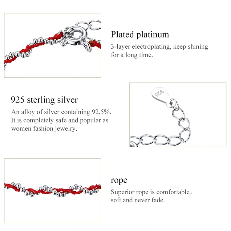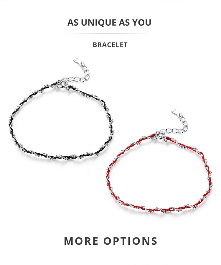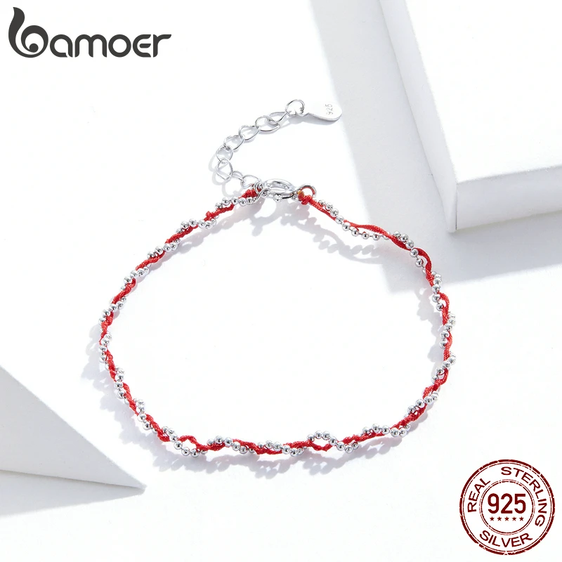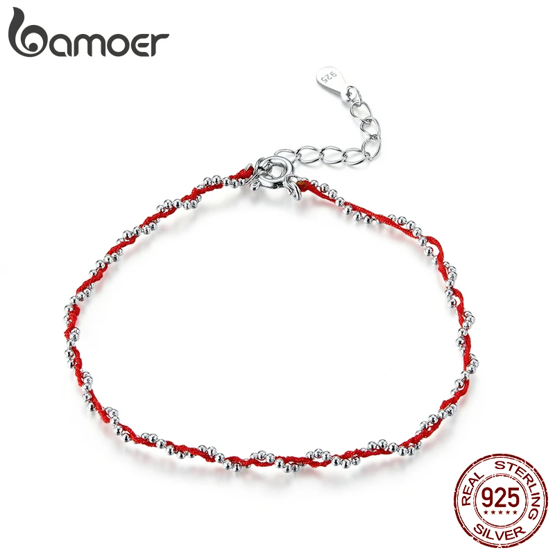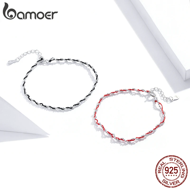 Браслет веревочный женский bamoer, черный и красный, с цепочкой серебряные бусины 925 пробы, подарок на Новый год 2020, SCB173