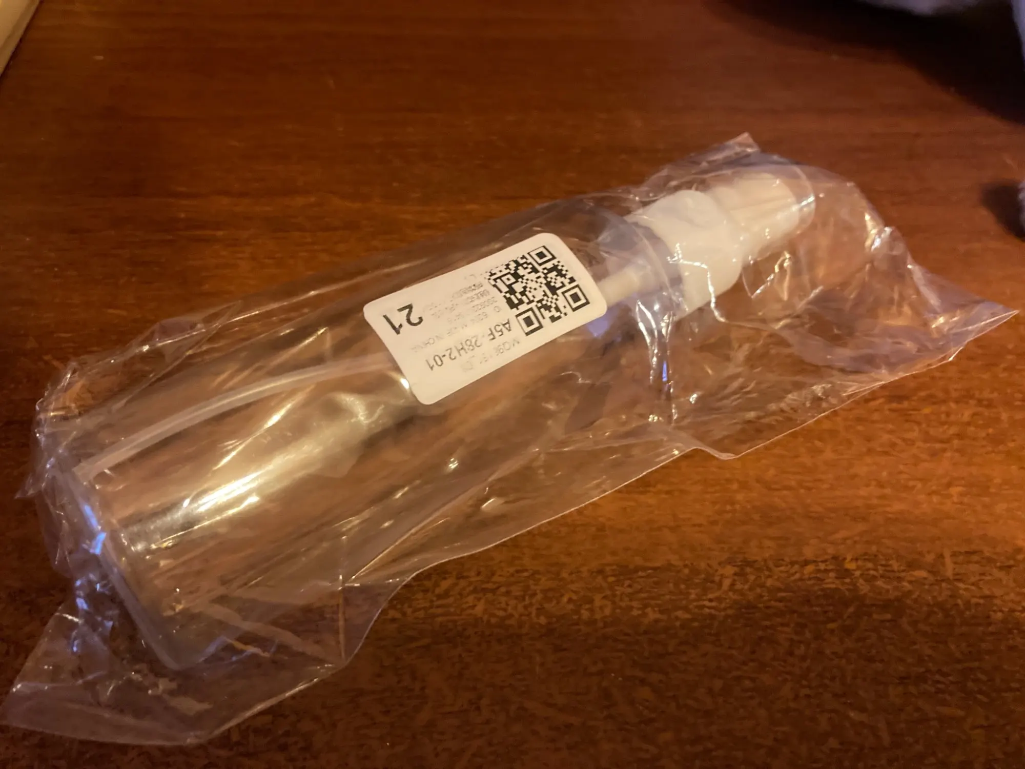 Шло 2.5 месяца, но дошло. Не воняет, брызгает хорошо. Обычный пластиковый пузырёк.