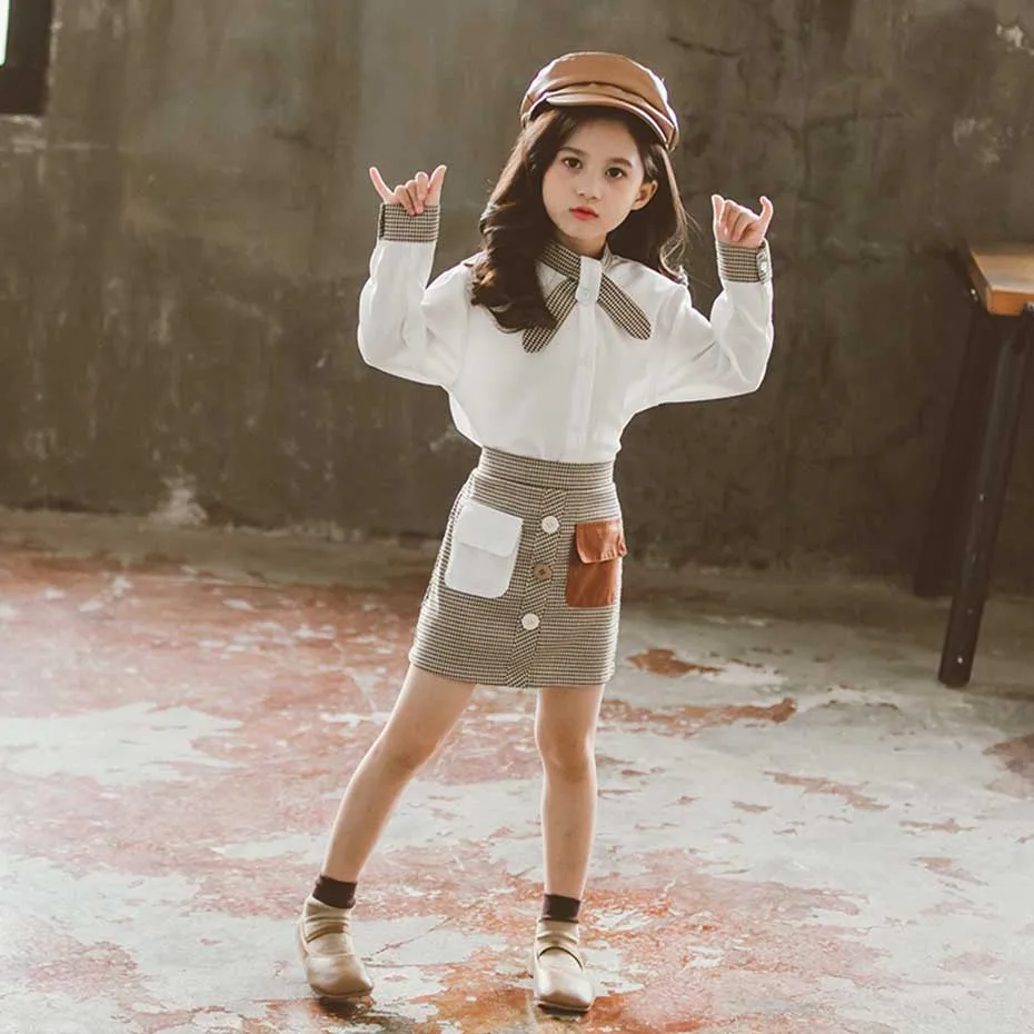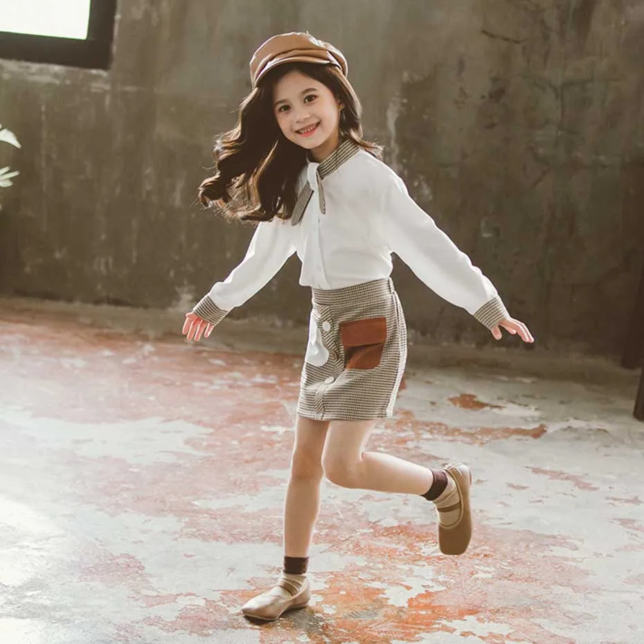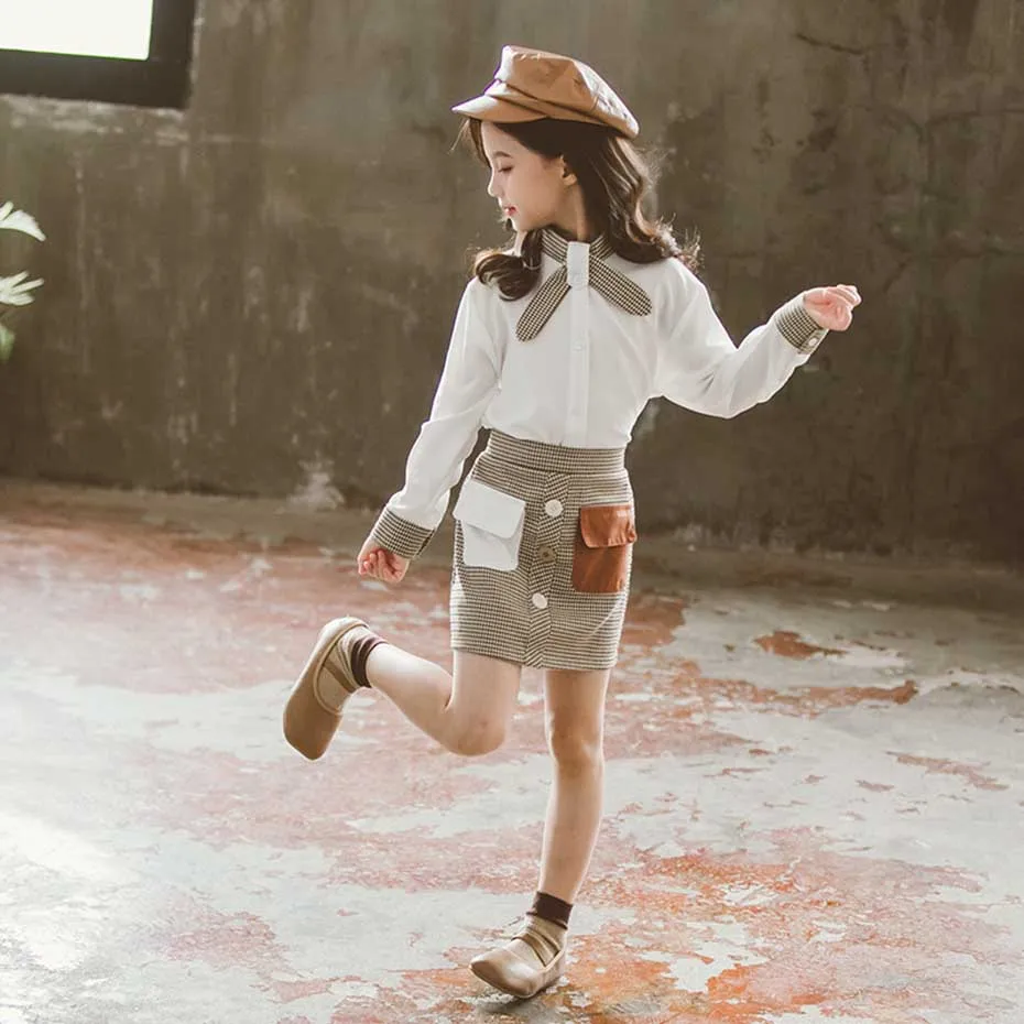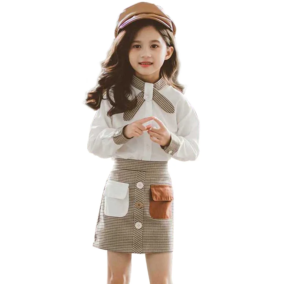 Юбка и рубашка для девочек, осенняя, в клетку, с длинным рукавом, на возраст 6, 8, 10, 12, 14