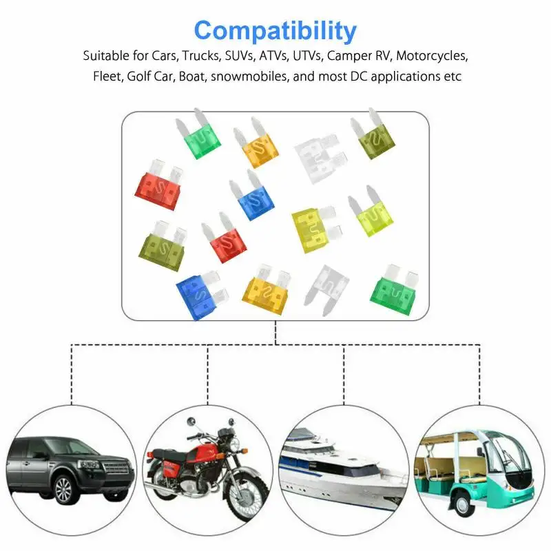 Совместимость: эти различные предохранители специально разработаны для автомобилей, грузовиков, внедорожников, квадроциклов, внедорожников, автофургонов, мотоциклов, флотов, гольф-автомобилей, лодок, снегоходов, а также для большинства общих приложений постоянного тока и т. д., покрытие таких компонентов, как радио светильник, поворотники, И т. д. этот набор поставляется с 120 небольшими лопастными предохранителями и 100 стандартными лопастными предохранителями, необходимыми для каждого владельца более чем одного автомобиля.