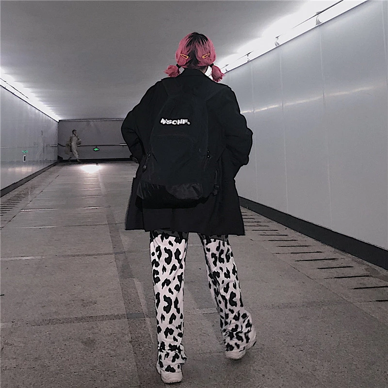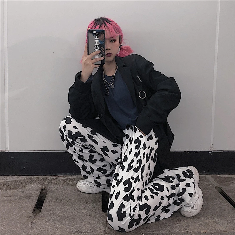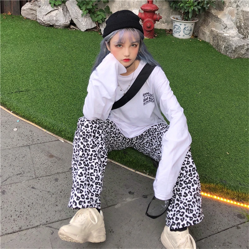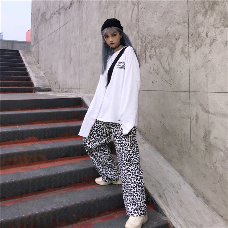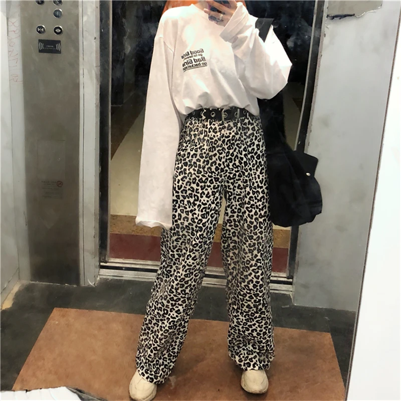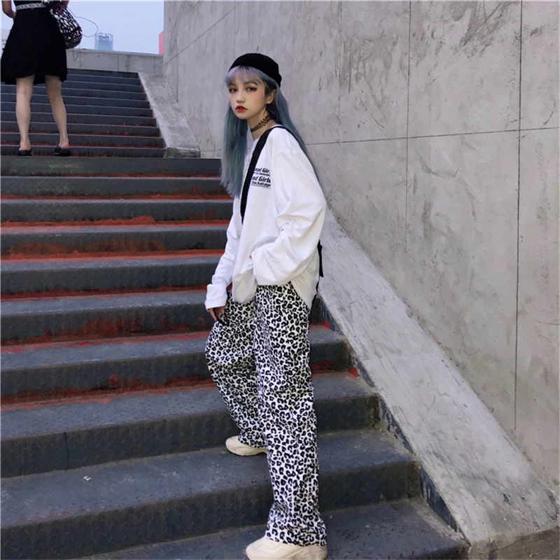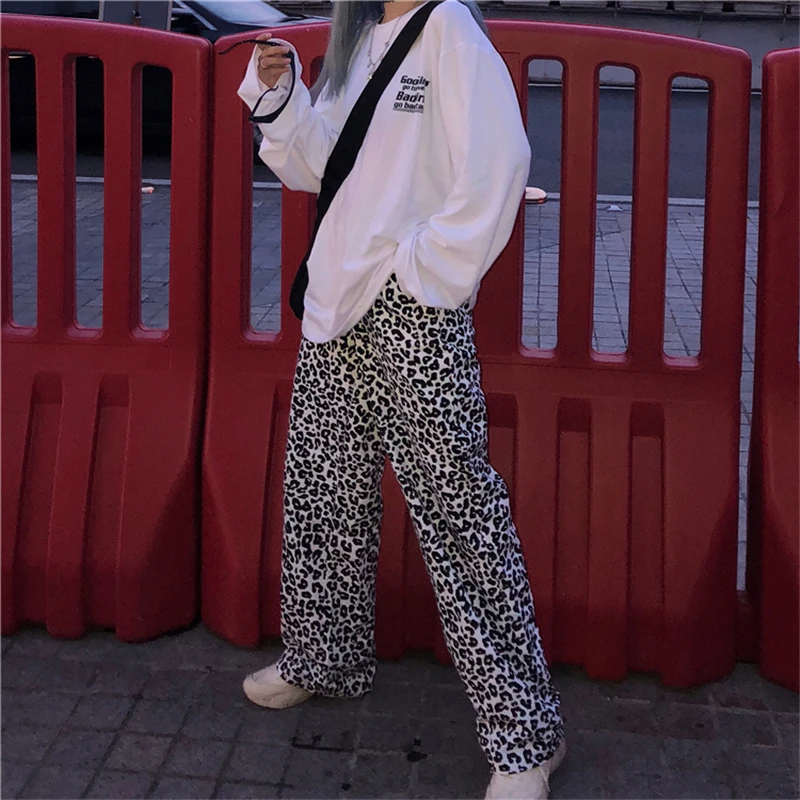 Винтажные леопардовые брюки, модные прямые брюки большого размера в Корейском стиле, Ulzzang, Harajuku, хип-хоп, Свободные повседневные женские брюки с широкими штанинами