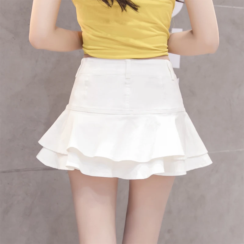 Женская джинсовая мини-юбка с высокой талией, синяя или белая короткая юбка-микро юбка из денима с оборками, школьная юбка фигуристки в уличном стиле на лето