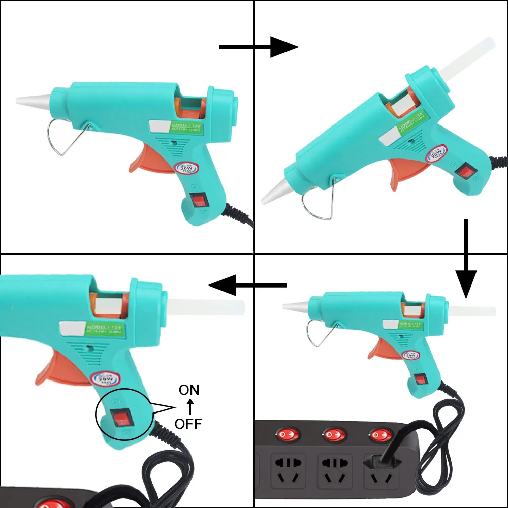 1. Чтобы предотвратить обжигание, пожалуйста, не прикасайтесь к раствору клея, который выходит из пистолета. 2. Для того, чтобы сделать вашу работу плавно, пожалуйста, предварительно Нагрейте клеевой пистолет в течение 3-5 минут (время разогрева) перед использованием. Примечание: клей не может быть снят после использования.