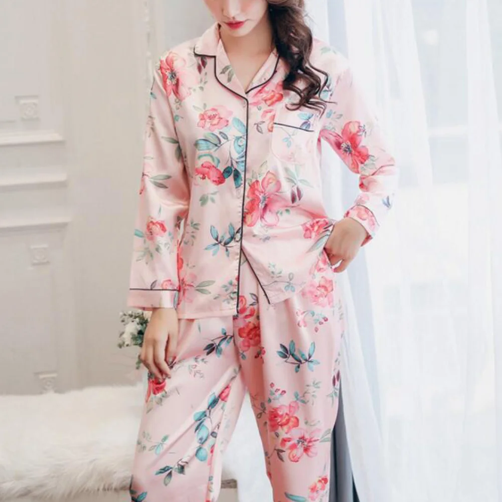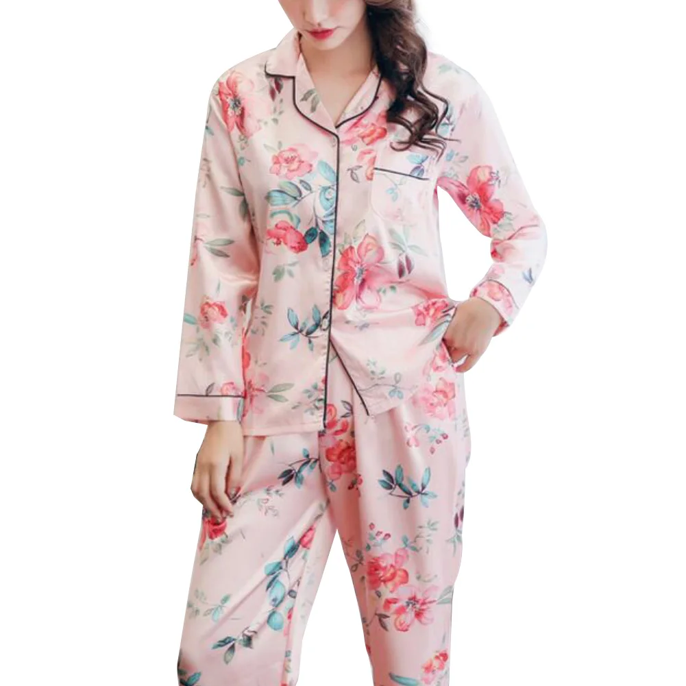 Пижамный комплект для женщин с цветочным принтом, топ с длинными рукавами, брюки, имитация шелка, одежда для сна, пижама, костюм для женщин, домашняя одежда для женщин, весна