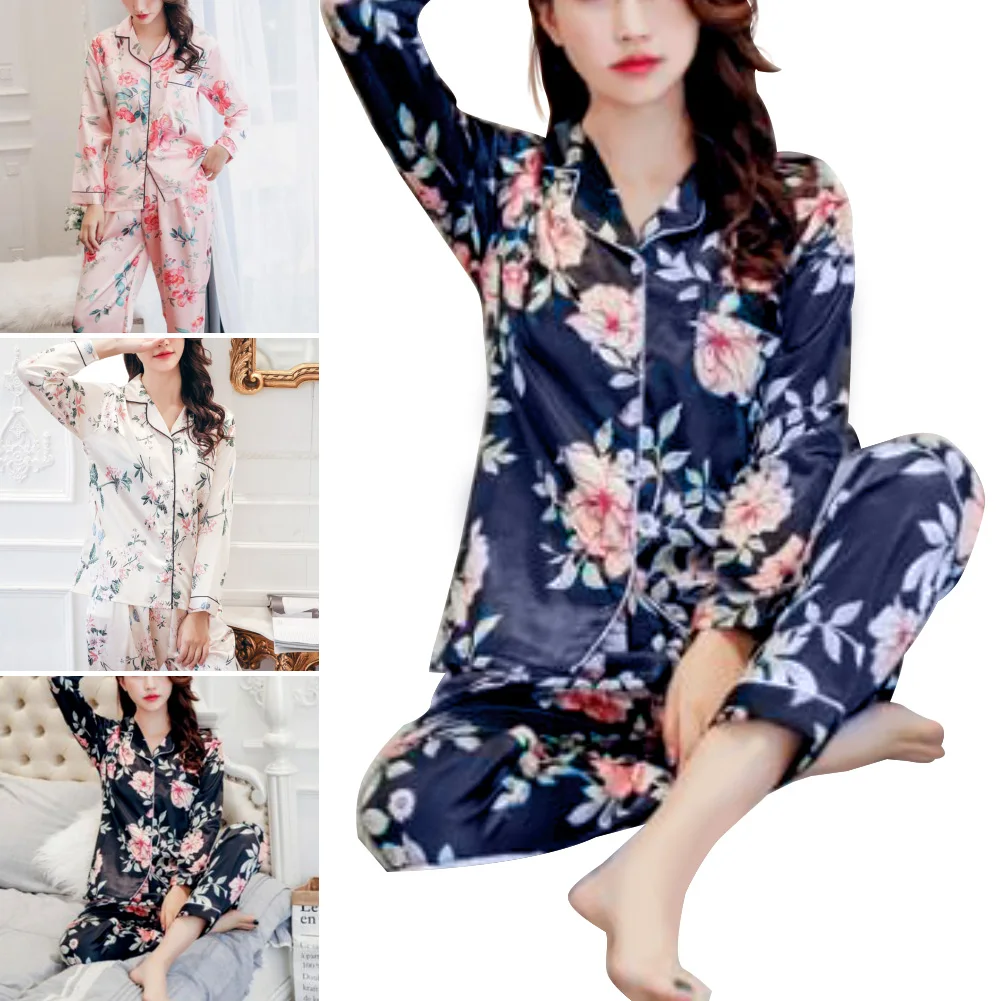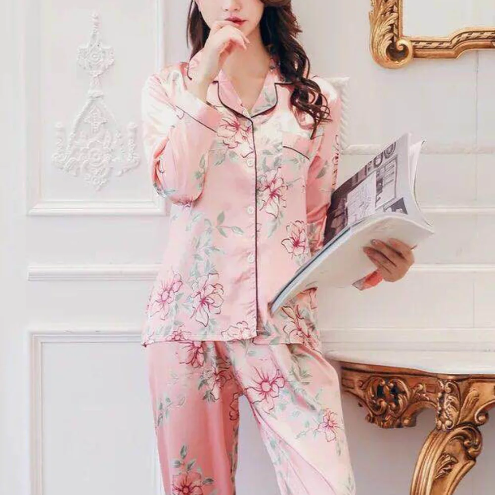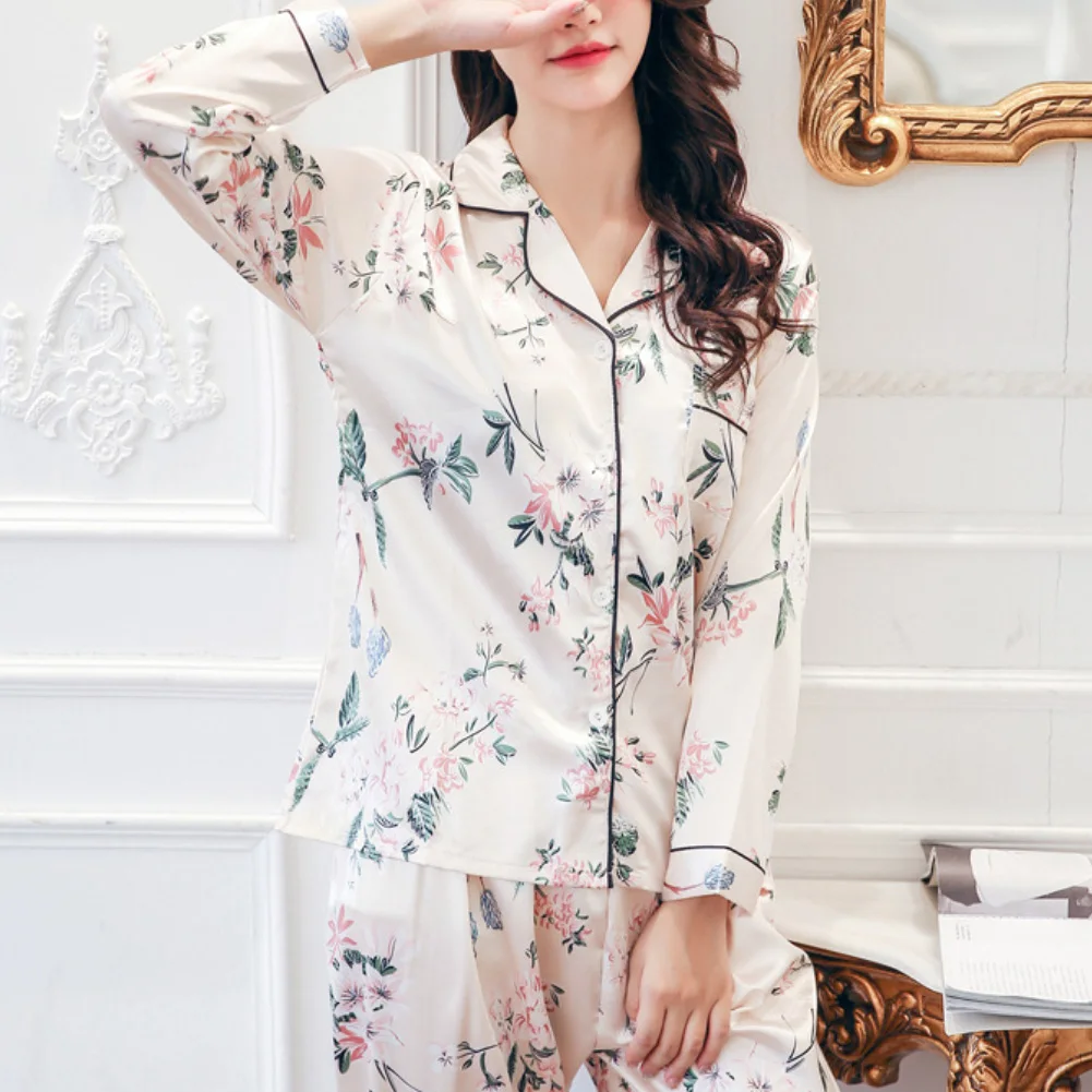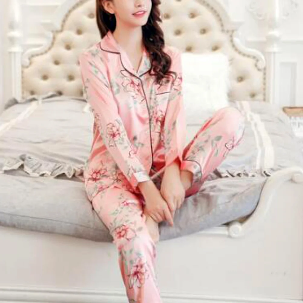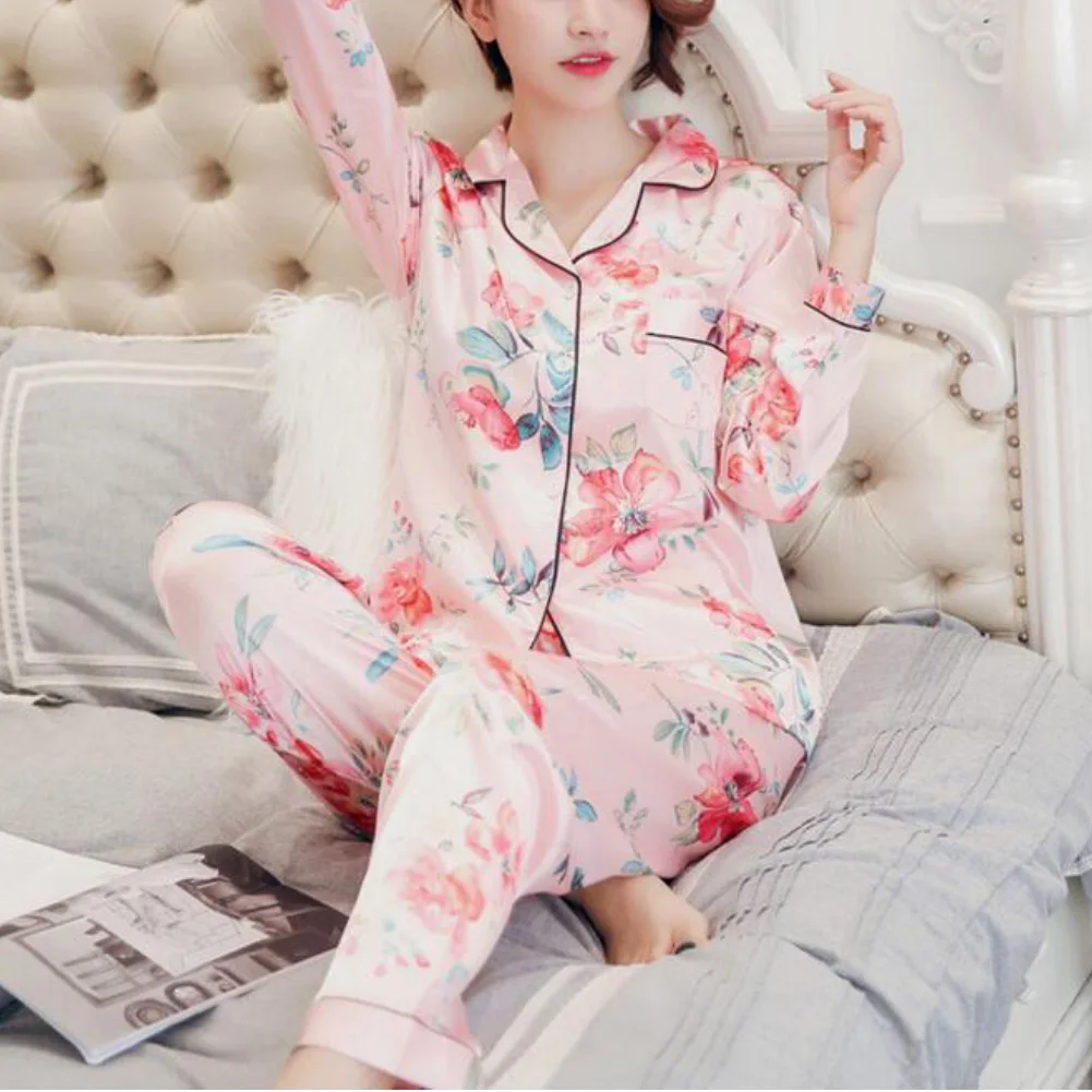 2 шт осень имитация цветочный принт шелковые женские пижамы набор удобные и шелковистые милые с длинным рукавом Дамские домашние услуги