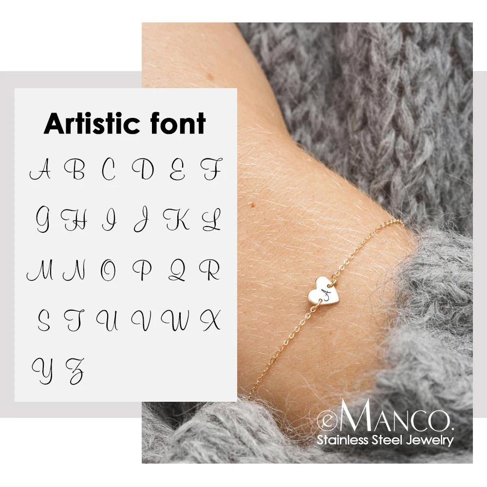 EManco гравировка художественный шрифт Алфавит браслет для женщин 316L нержавеющая сталь модные очаровательные браслеты минималистский браслет в форме сердца