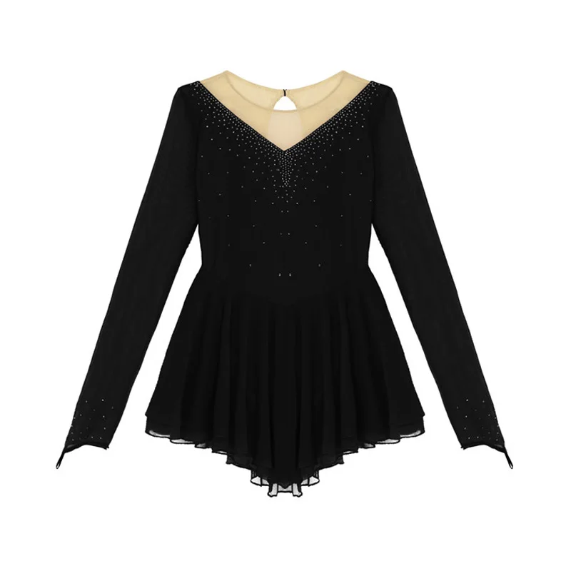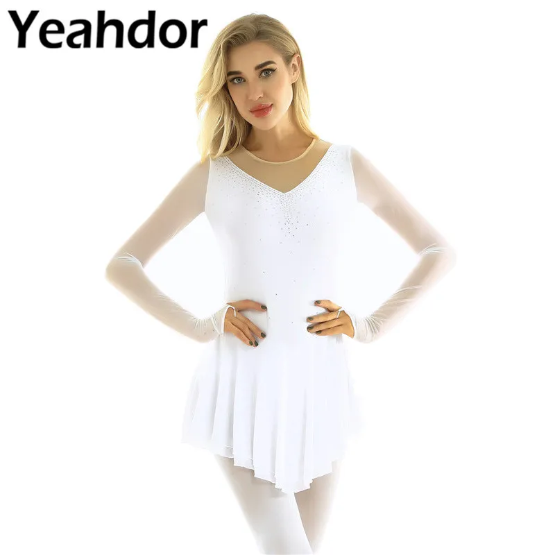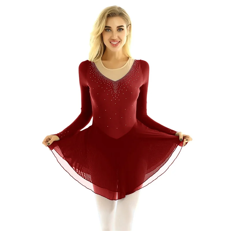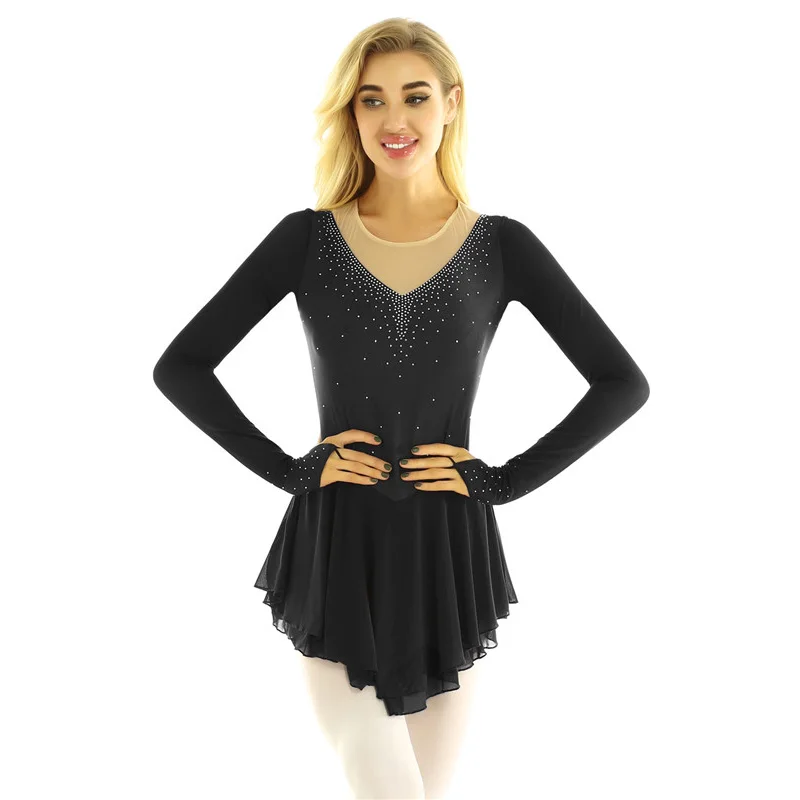 Женское платье для взрослых с круглым вырезом и длинным рукавом, блестящая фигурка из стразов, платье для катания на льду с кончиком пальцев, балетное платье для танцев, трико