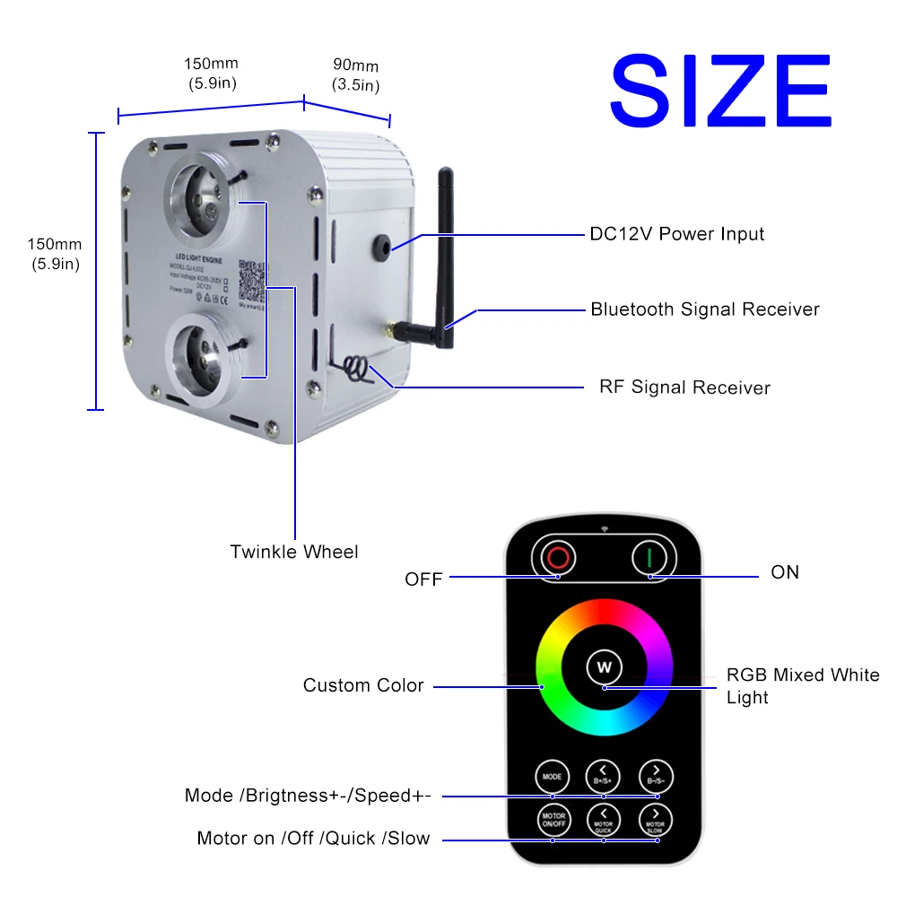 Посылка входит1x32 Вт двухслышащий RGB мерцающий световой двигатель(Оптоволоконный кабель в комплект не входит)1x сенсорный пульт дистанционного управления RF1x адаптер питания1 Руководство пользователя