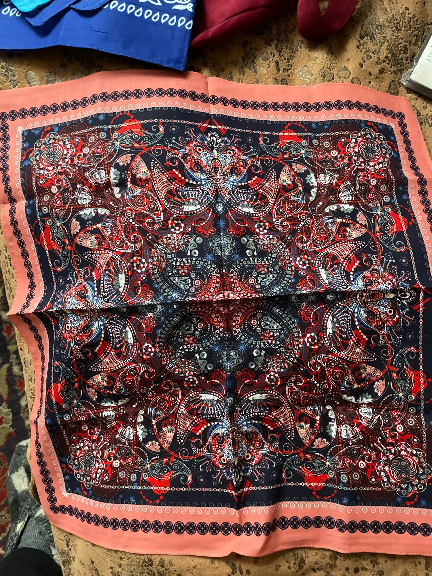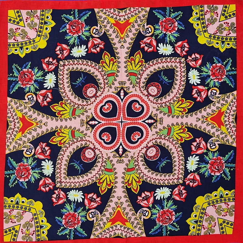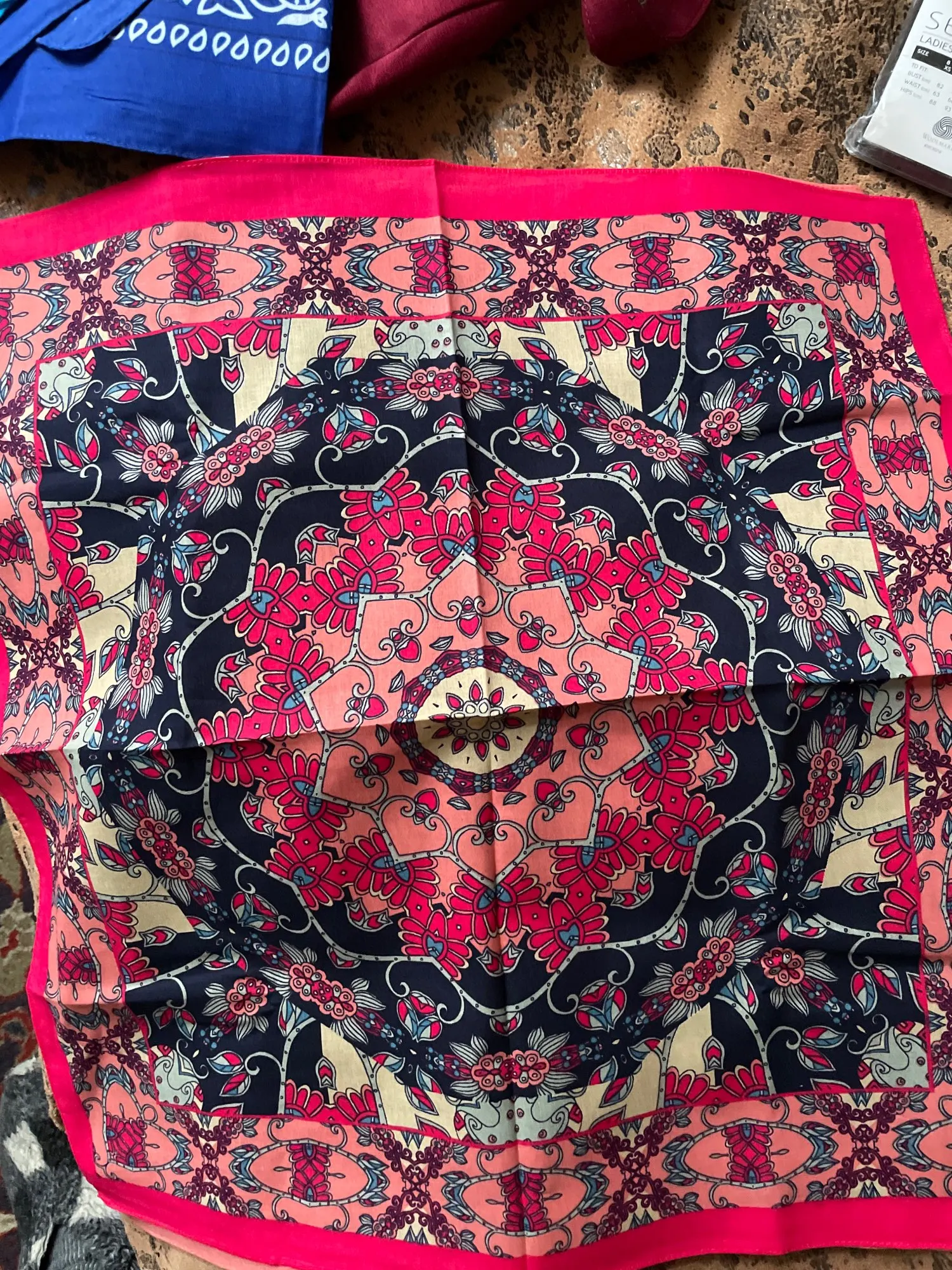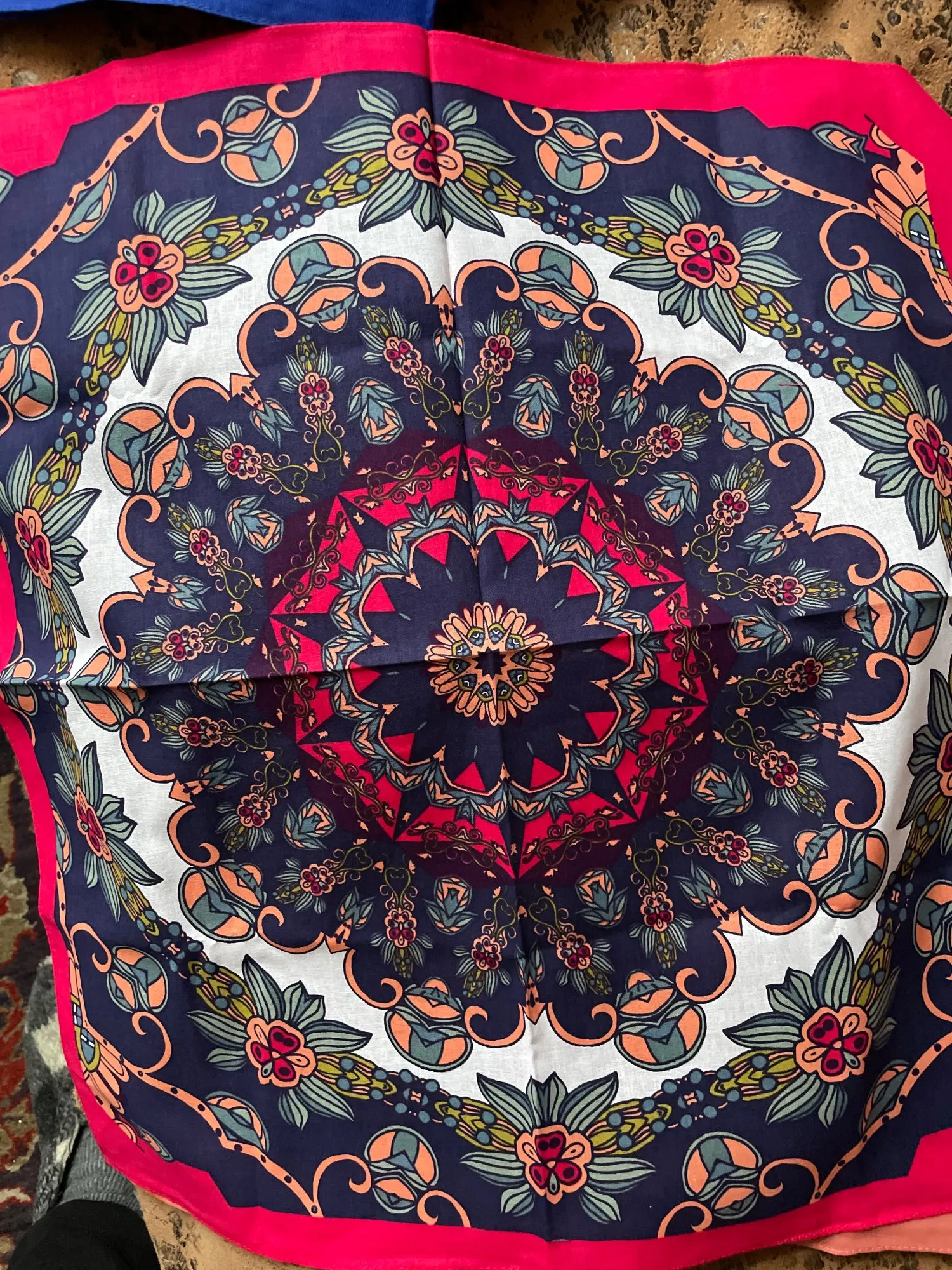 Заказ пришел очень быстро. Платок соответствует описанию. Не очень хорошо обработаны края. При стирке вручную потекла розовая вода. Но яркость красок сохранилась. Материал хлопок. Спасибо