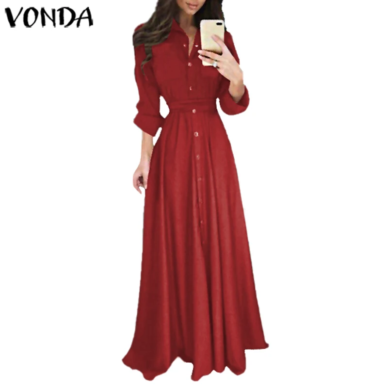 VONDA элегантные вечерние платья-Макси платье 2021 для женщин пикантные отложной воротник с длинными рукавами и пуговицами для детей; Свободные платья в богемном стиле Пляжное платье S-5XL